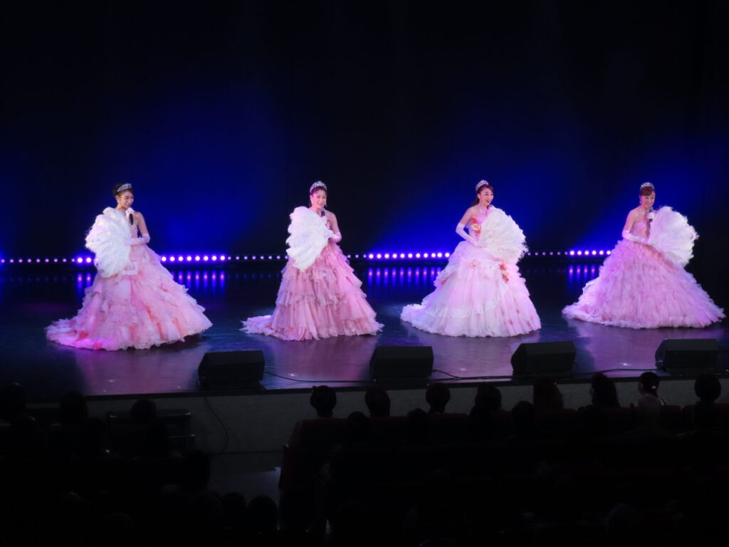 「ザ・レビュー」の曲目で幕が開き、「ベルサイユのばら」の名曲が続くと、オープニングから会場はすっかり<タカラヅカの世界>に染まりました。桐さんが「6名の宝塚OGで頑張って舞台を作っていきたいと思います」と挨拶。メンバーの自己紹介を「若い者順で」とウイットに富んだトークで会場を沸かせ、日向燦さん、毬穂えりなさん、絵莉千晶さん、美苑えりかさん、しのぶ紫さんの順で挨拶しました。