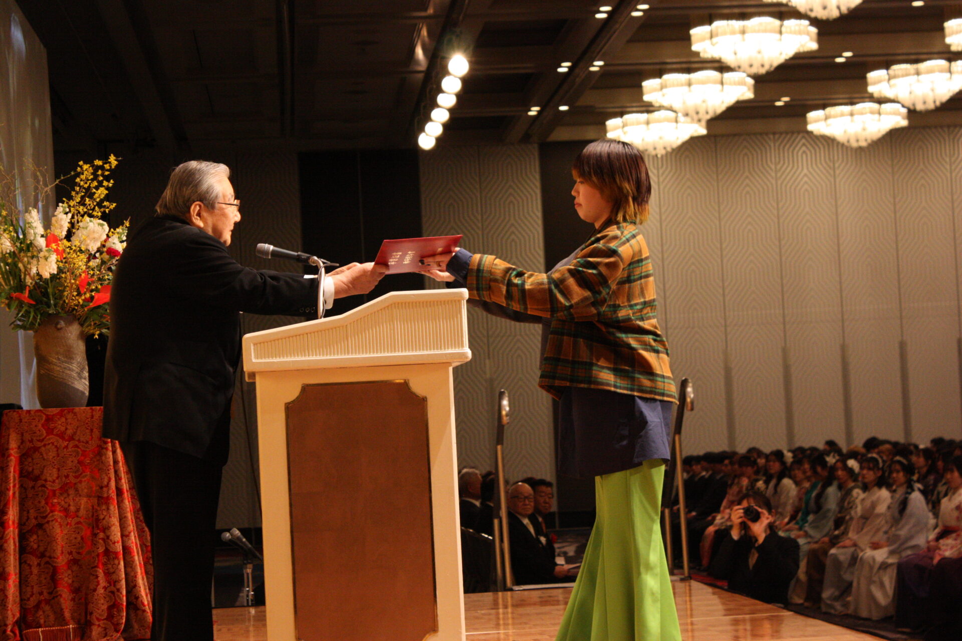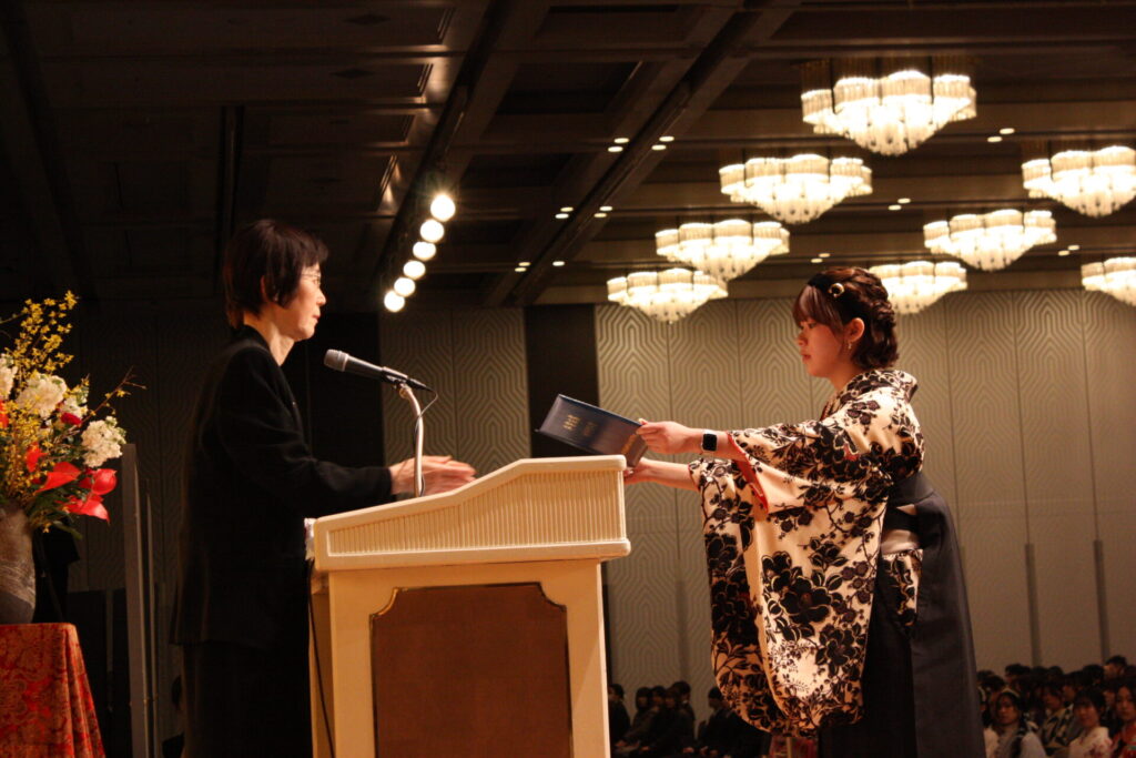 大勢の保護者、来賓が出席する中、式典は厳粛な雰囲気の中で始まりました。国歌斉唱の後、卒業証書と専門士称号の授与が行われ、東洋医療専門学校を代表して森茉白さんが、新大阪歯科技工士専門学校を代表して田中杏実さんが、新大阪歯科衛生士専門学校を代表して中道聖さんが登壇。それぞれの学校長から証書を受け取りました。