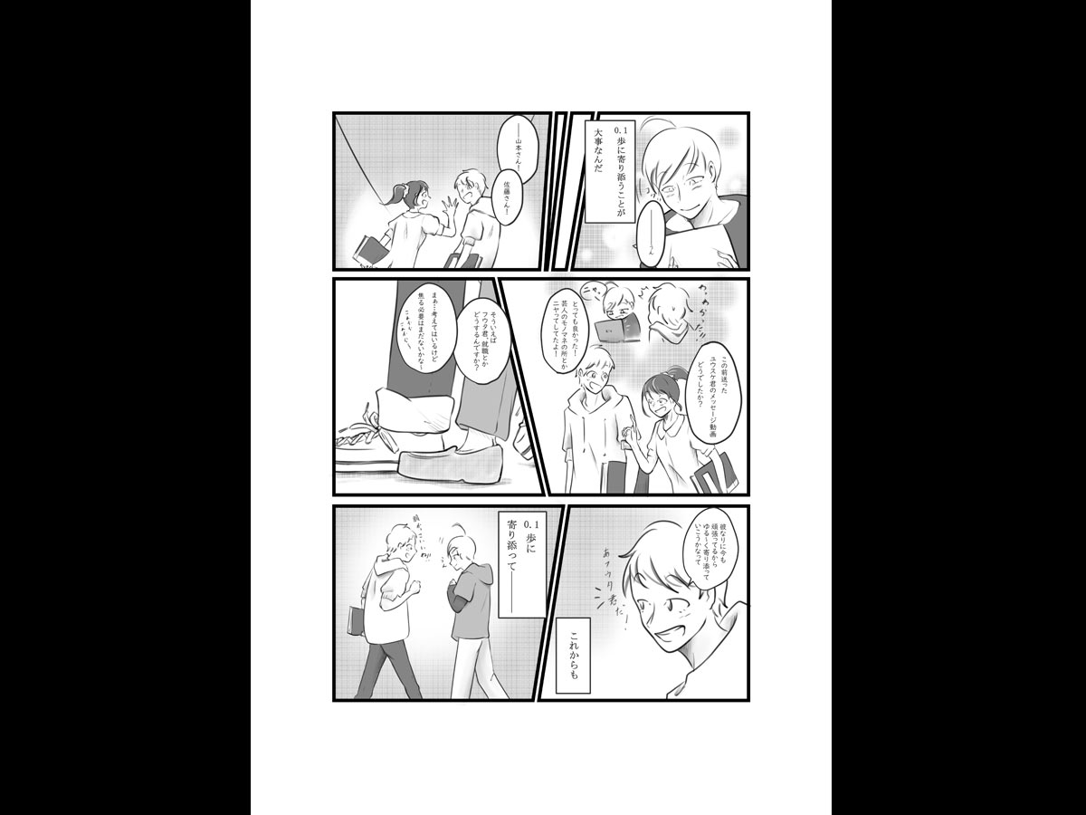 マンガ化することによって活字離れが起きている若者世代にも手に取ってもらい、福祉・介護の魅力をわかりやすく、効果的に多くの方に知ってもらう狙いがあります。マンガ制作にあたり、受賞された方にインタビューをしたり、作文当時の写真を頂いたり、実際に施設を見学させて頂いたりして、情報収集を行いました。そして、作文と取材等で得た情報を基に、マンガとイラストを制作しました。