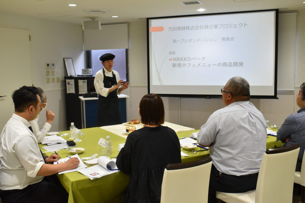 学生ならではの視点で、来場される様々なゲストが写真を取りたくなるように見た目、インスタ映えする盛り付けにこだわり、因島やしまなみ海道の自然の魅力が詰まった美容・健康に留意したメニューを考案。万田発酵の担当者の方々にプレゼンテーションしました。