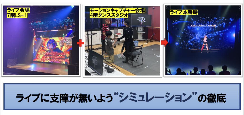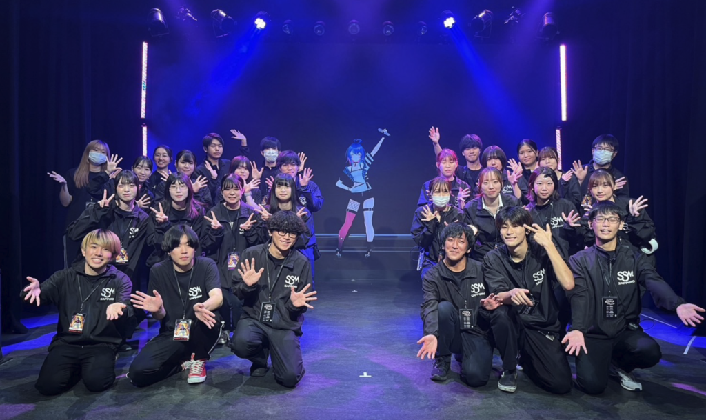 スタッフとして参加した音響、照明、映像、制作、運営の学生にとっては初めての試みとなるバーチャルライブです。Vtuberには欠かせないモーションキャプチャーの使用やmバーチャルライブならではの照明作り、遠隔で連携を取りながらアーティストの要望に合わせた音作りなど、最先端のテクノロジーを駆使したバーチャルライブを作り上げることができました。