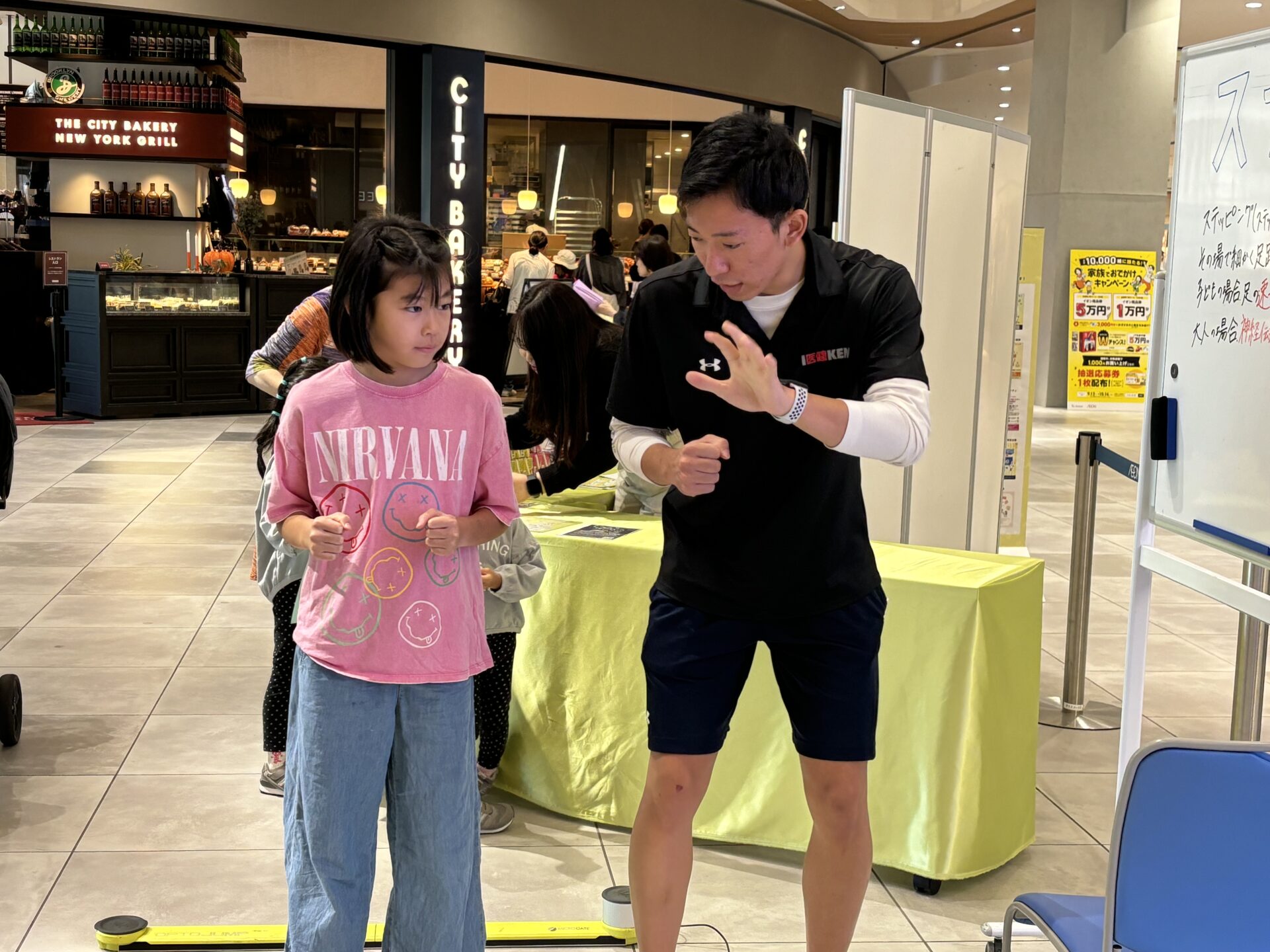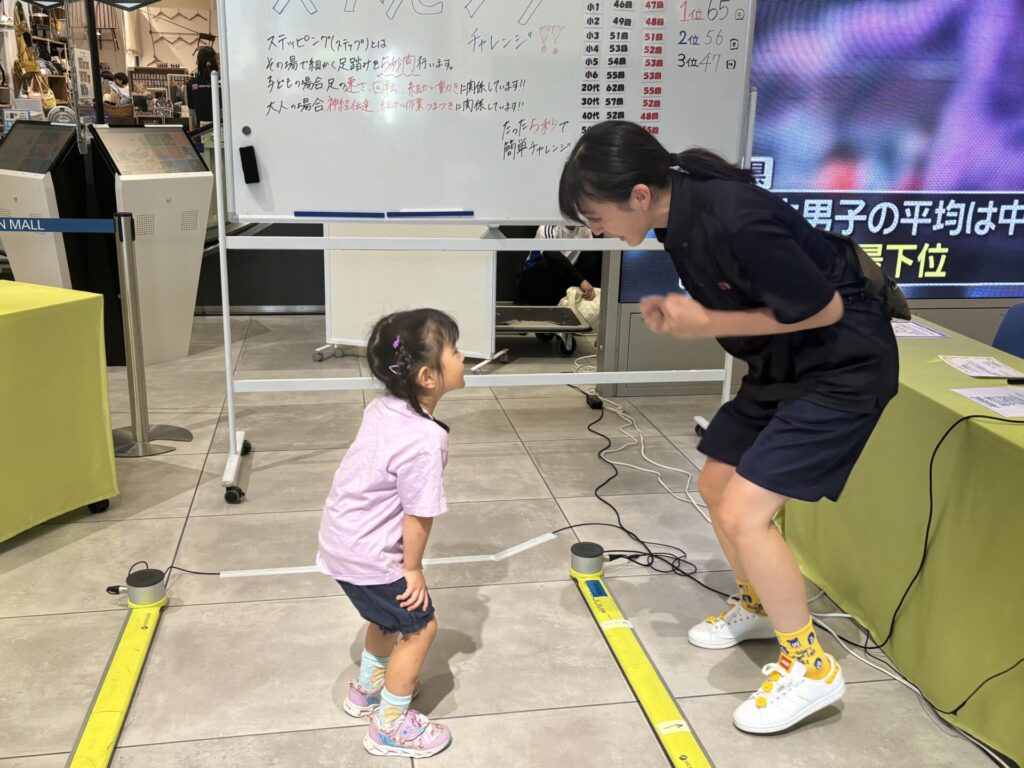このイベントは、スポーツ科学の力を子どもたちに知ってもらうとともに、数字で見えるリアルな結果により、子どもだけではなく大人たちにもステップ動作が生み出す効果を体感してもらうことを目的としています。イベント当日、大勢の子どもたちと保護者の方々が参加し、ステッピングに挑戦。多くの笑顔が見られました。測定結果の数字がモニターに映るため、通りがかりの人たちも興味を持ち、順番を待って体験する、という大きな流れができました。体験ブースの様子をSNSでスタッフとともに発信し、イベントは大盛況となりました。