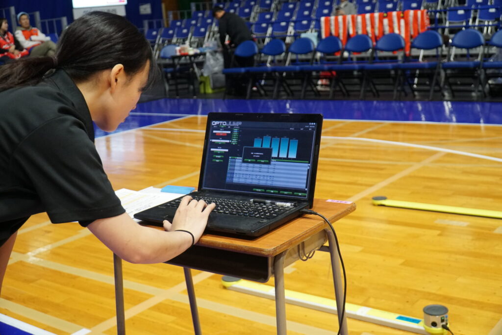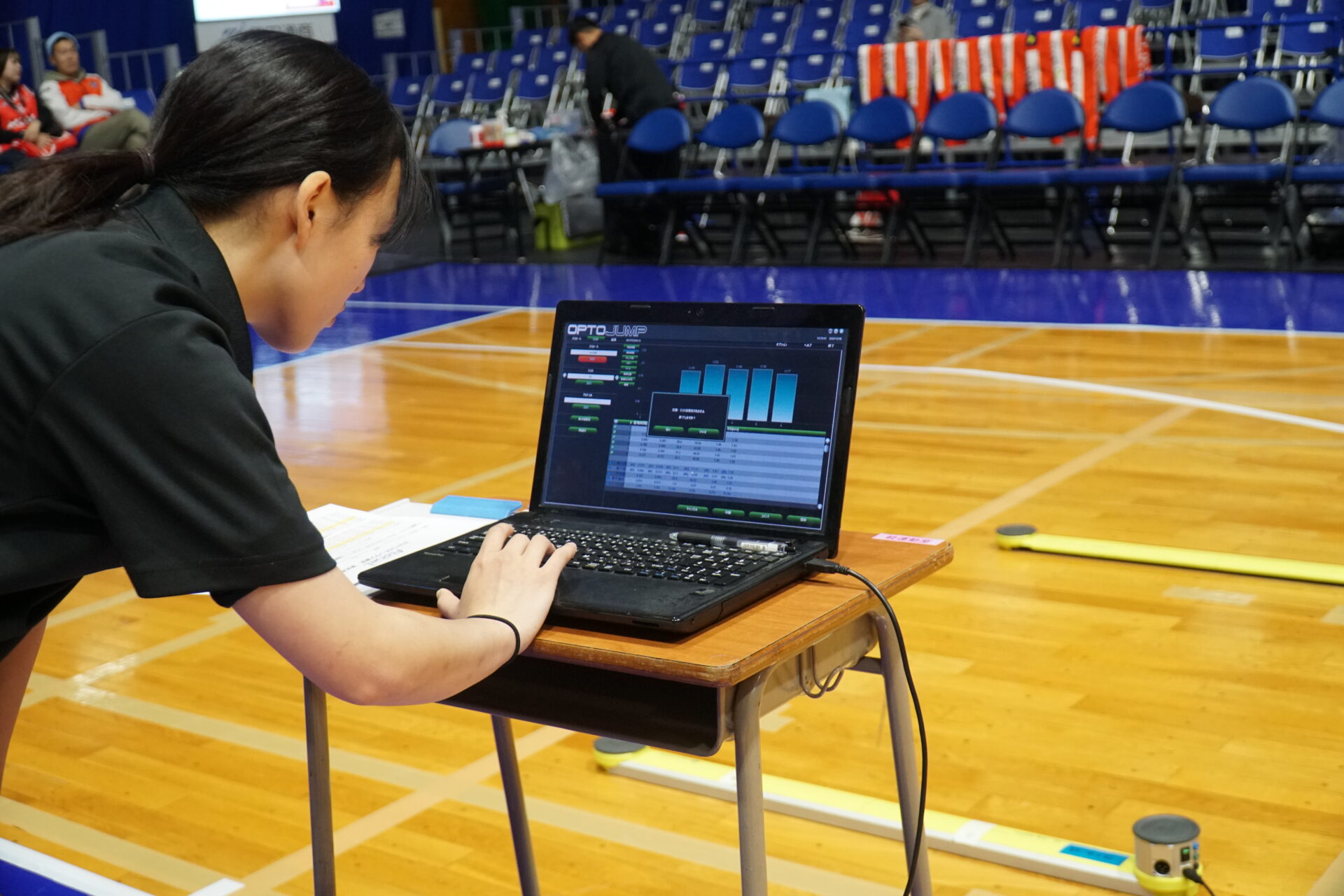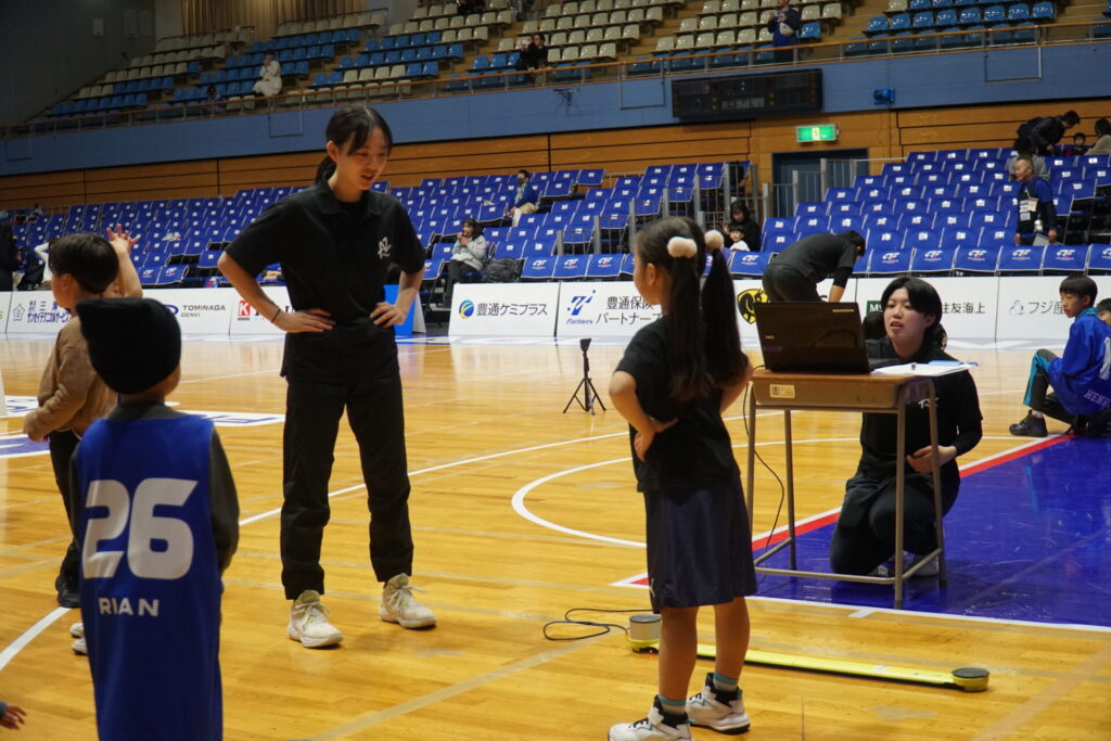 イベントの成功を受けて、アローズジムから2つ目の企業課題として、男子プロバスケットボールリーグ・Bリーグの試合会場での測定体験イベントの運営を任されました。12月8日(日)に名古屋市稲永スポーツセンター(同市港区)で行われたファイティングイーグルス名古屋VS広島ドラゴンフライズの試合でエキシビジョンイベントを開催し、多くの参加者がステッピングに挑戦しました。