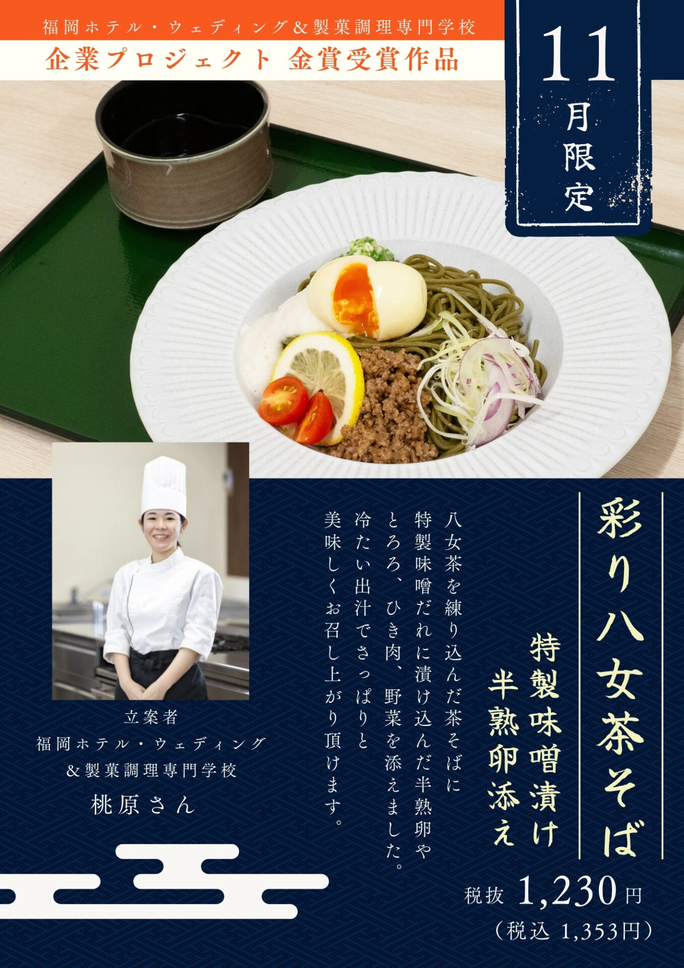 最終審査で金賞に選ばれたのは、八女茶を練り込んだ茶そばに半熟卵とろろ、ひき肉、野菜を添えた「彩り八女茶そば」。このメニューは商品化され、八女市健康増進施設・べんがら村で販売されました。