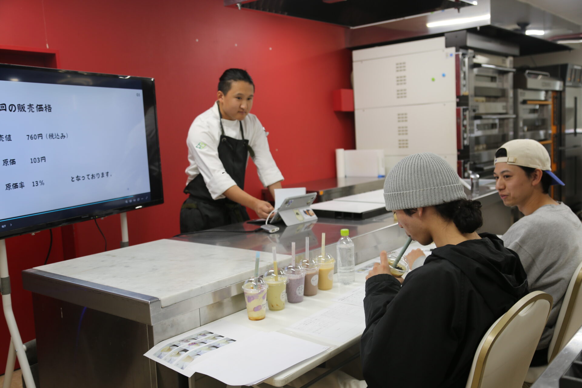 学生たちは考案、試作、改善を繰り返し、スムージー商品を開発。完成した商品をプレゼンテーションしたところ、商品化が決定し、期間限定で販売されました。フードロス削減のために、自分たちに何ができるかを考えることの大切さを学びました。