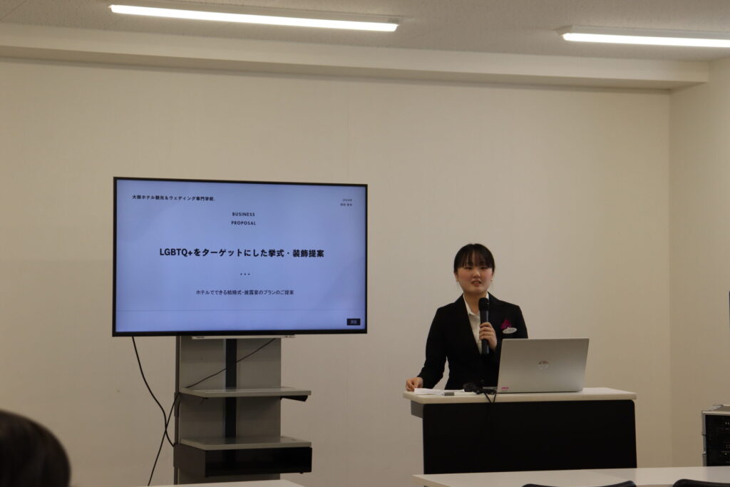 プレゼンテーションで学生たちが発表した企画は、大阪の観光地でのロケーション撮影と宿泊を組み合わせたフォトウェディングプランや、光と音の演出が楽しめるスマートリングを使ったセレモニー、LGBTQ+カップル向けのアトリウムを活用したパーティースタイルの結婚式などです。それぞれのアイデアに創意工夫が込められており、「スイスホテルで結婚式を挙げたい」と思ってもらえるような魅力あふれる提案ばかり。ホテルウェディングの新たな可能性を感じられる取り組みとなりました。