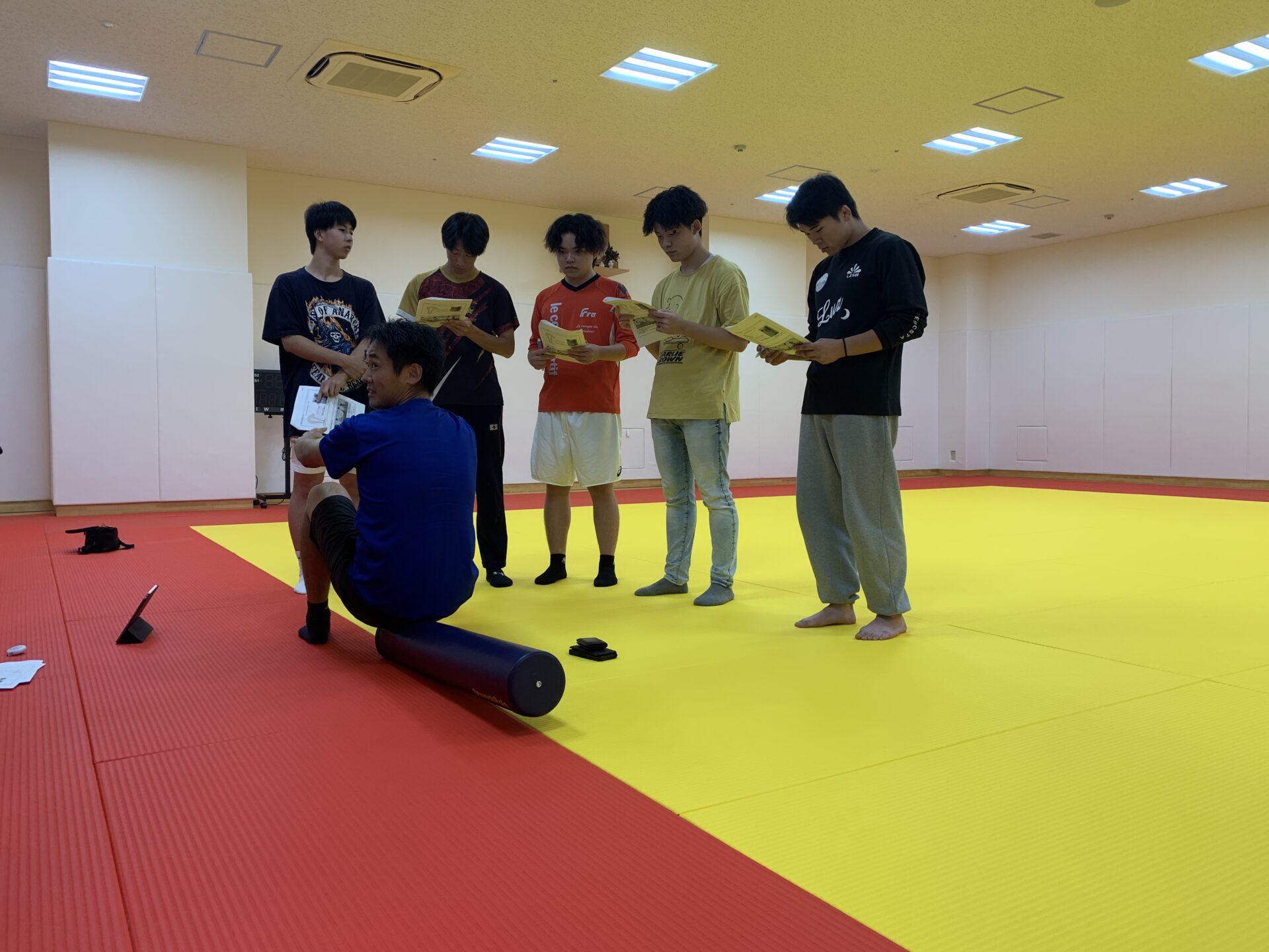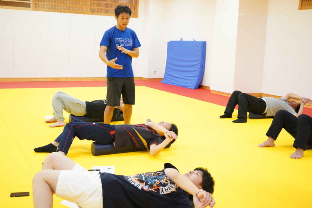 ストレッチポールなどの体幹ケアグッズはスポーツ選手から医療従事者まで広く活用されていますが、体幹ケアグッズを使用したコアコンディショニングと一般的に行われる体幹トレーニングの効果を比較した検証はあまり行われていません。そこで、本校の学生たちは、ストレッチポールをはじめとする健康ツールの開発・製造・販売などを行っている株式会社LPNと連携して、コアコンディショニング群と体幹トレーニング群に分けてエクササイズを行い、比較検証を行いました。