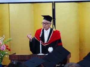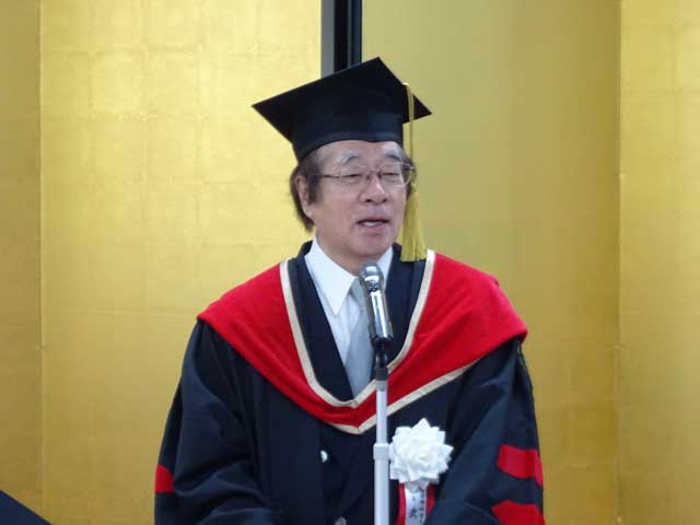 次いで、学校法人大阪滋慶学園を代表して、理事長でもある浮舟邦彦総長が「仕事や家庭をもちながら学業を成し遂げたその思いは、一人ひとりのキャリアを作っていく上で大きな支えになるでしょう。この医療安全の分野は日本では研究者の少ないジャンルであり、皆さんはパイオニアとしてこの分野を開拓し広げていってください」と述べました。