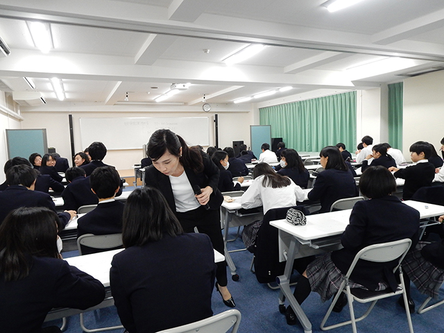 クラーク記念国際高等学校大阪天王寺キャンパス(天王寺区寺田町)では10月31日(水)、大阪保健福祉専門学校の教務副部長、吉﨑歌葉子先生が「医療秘書の仕事」と「サービス接遇」をテーマに、2コマの授業を行いました。
