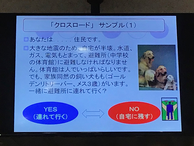 矢守先生か開発された防災ゲームでは、ゲーム感覚で災害時の対応を体験し、防災を自分のこととして考えることができます。すべての設問は阪神・淡路大震災で出てきた課題だそうです。例えば「家族同様の愛犬を避難所に連れて行くか」という設問。必ず「イエス」か「ノー」で答えなければなりません。このゲームには正解はなく、お互いが問題点を出し合い、話し合うことが大切です。それによって多くの価値観や視点にも気づけ、ゲームをしながら防災につながる行動を考えることがポイントだということでした。