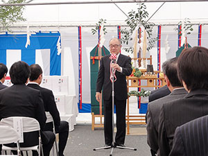 神事のあと、竹内市長が地元を代表してあいさつ。「昨年6月の市議会以来、スピード感あるスケジュールが決まり感謝しています。この専門学校設置は医療福祉関係が力を合わせて邁進しなければならない事業であり、しかも鳥取駅周辺での久々の大型民間投資です。地域のニーズに応えて夢と希望をもたらしてくれる事業として将来への大きな誇りとなるに違いありません。またこの一角は大きく生まれ変わり、地域発展の象徴となるでしょう」と述べました。さらに同市長は「校舎の完成イメージ図を見ましたが、白色を基調にしたスマートなデザインで、正面と側面には校名が掲げられ、この学校の発展が目に見えるようであります。滋慶学園グループの実践的教育によって地域に多くの優秀な人材を送り出していただきたい」と期待を込めました。