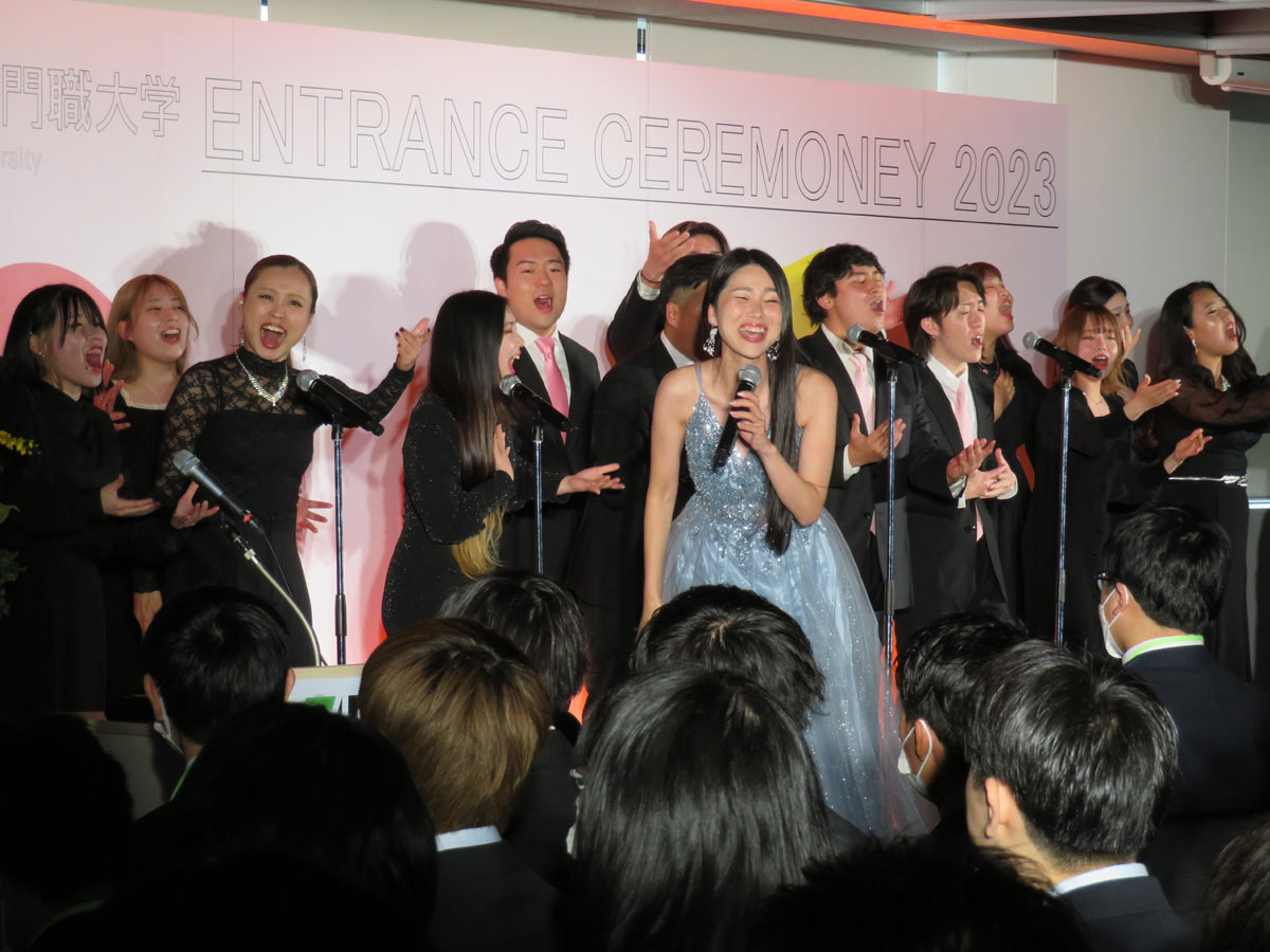 東京スクールオブミュージック専門学校渋谷の池末信学校長の指揮、ジャネット・ジャクソンのバックコーラスなど多くのアーティストと共演してきた同校卒業生の斉藤早春さんのヴォーカルで、夢に向かって歩きはじめた新入生の入学を祝福し、励ましました。