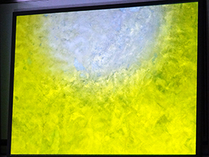 フィーリングアーツは、土と墨汁と金粉を使って作った抽象画に様々な色の光をあて、心の安らぐ音楽とともに鑑賞してもらう体感芸術です。北村先生が大阪芸大の芸術学部美術科を卒業後の1980年に渡米し、サンフランシスコで土を画材とした抽象画に光と音楽を組み合わせてフィーリングアーツとして完成させました。