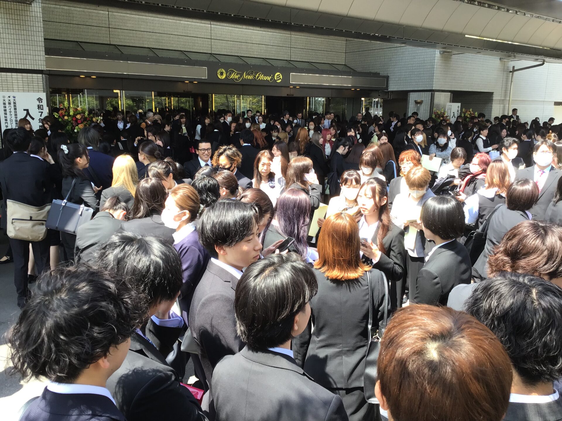 入学式を終えた新入生たちは会場外のロビーで談笑したり、桜が咲く大阪城公園の堀のほとりで記念写真を撮ったりして、さっそく新しい仲間たちとの交流を深めていました。