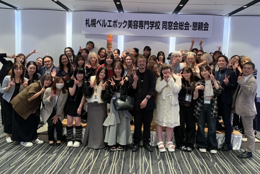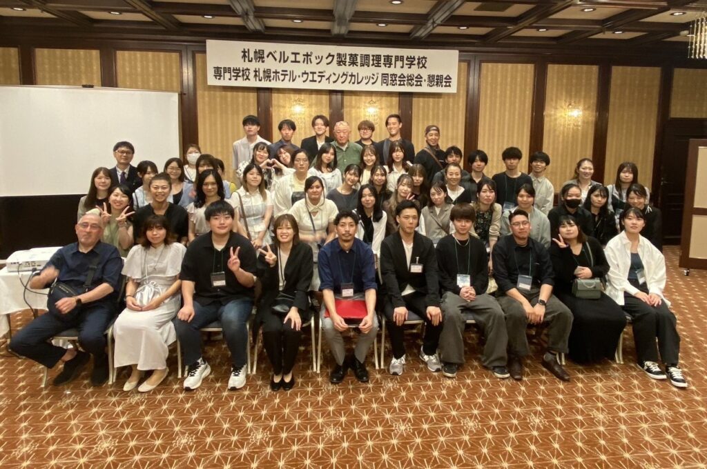 札幌ベルエポック美容専門学校と札幌ベルエポック製菓調理専門学校の両校は9月9日(火) に同窓会総会・懇親会を開催しました。毎年恒例の同窓会。平日の開催にもかかわらず、美容校で59名、製菓調理校で63名と、両校合わせて120名を超える参加者が札幌グランドホテルに集いました。上は第2期生から下は今年3月に卒業したばかりのOB・OGまで、幅広い年代の卒業生が参加する会となりました。