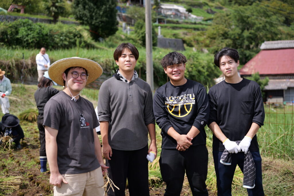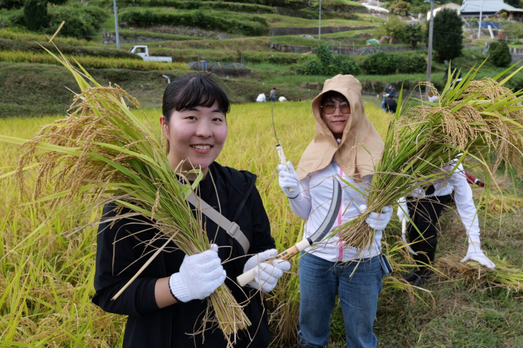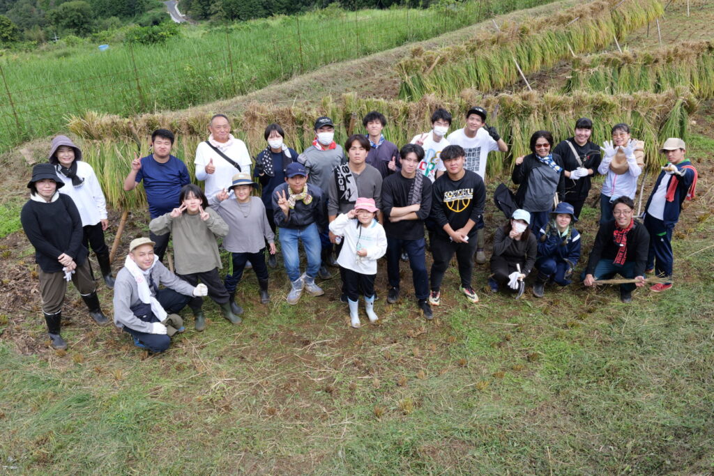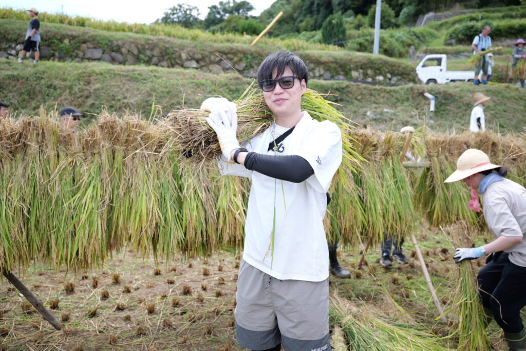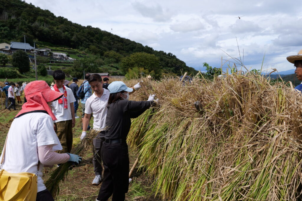 刈り取った稲をわらで結んで束ね、天日干しにするため長い竹の竿にかけて作業は完了。農作業の大変さを体感したひとときでしたが、作業の合間に眺める棚田の美しい風景に心癒され、学生たちの表情は達成感に満ちあふれていました。