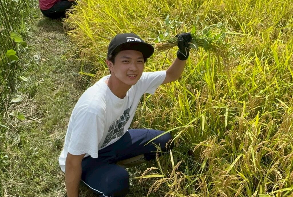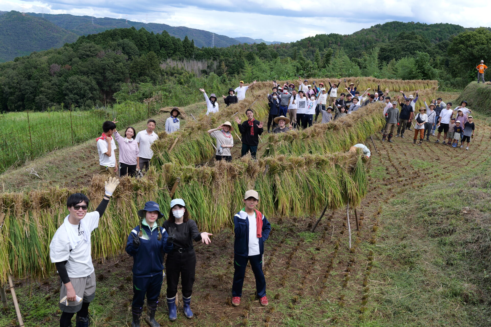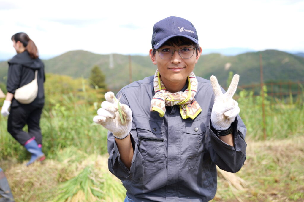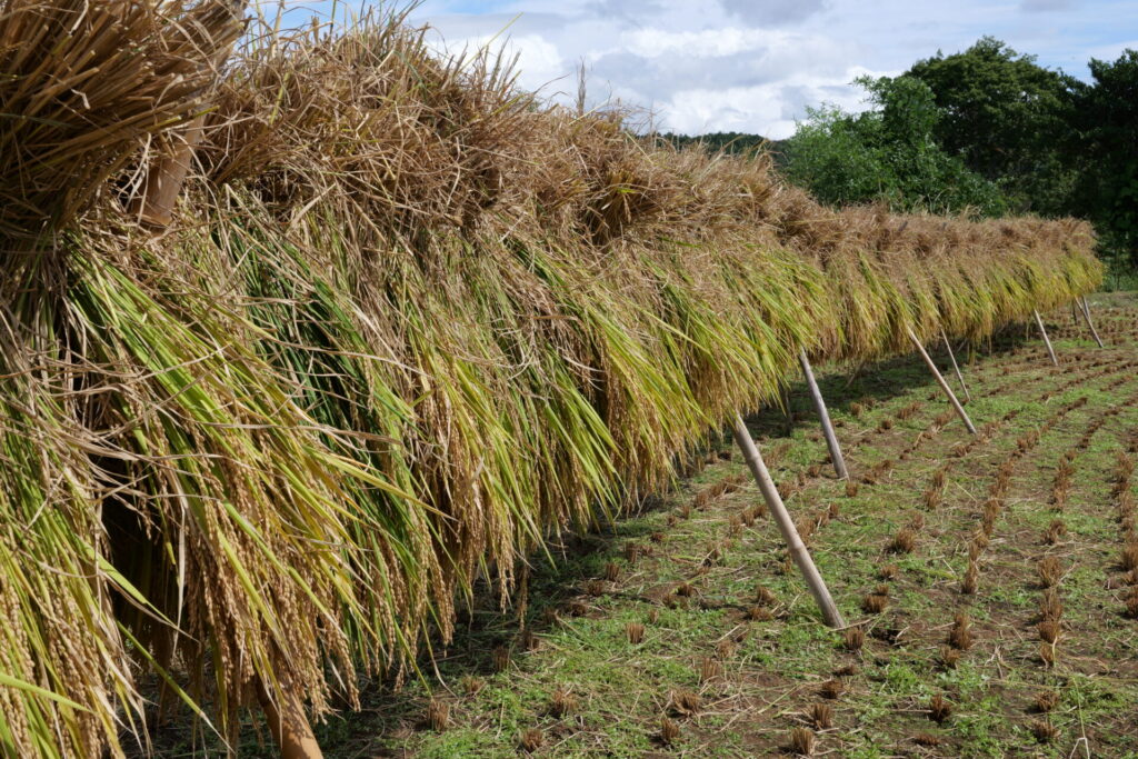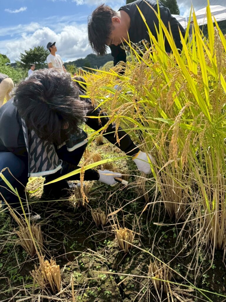 刈り取った稲をわらで結んで束ね、天日干しにするため長い竹の竿にかけて作業は完了。農作業の大変さを体感したひとときでしたが、作業の合間に眺める棚田の美しい風景に心癒され、学生たちの表情は達成感に満ちあふれていました。