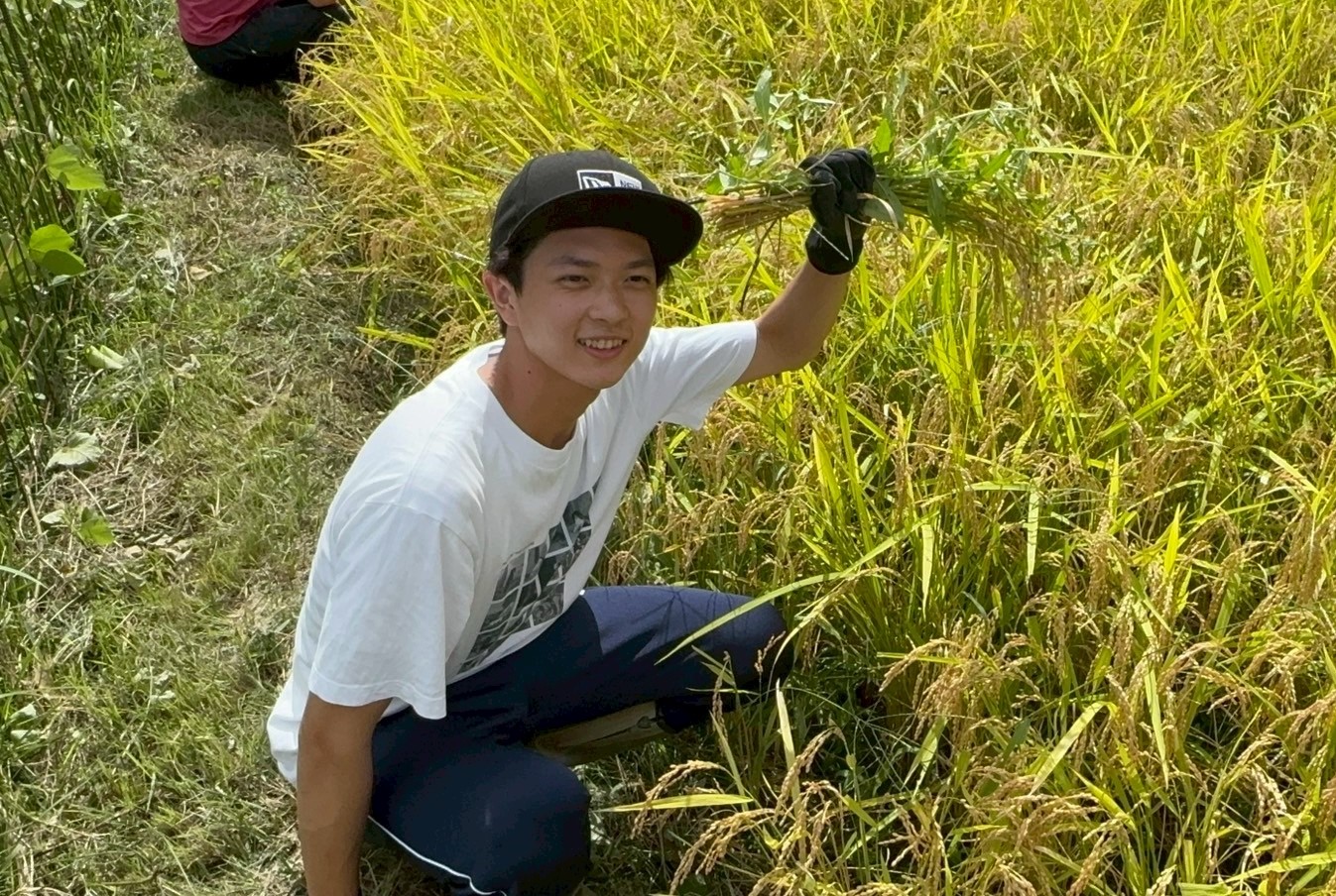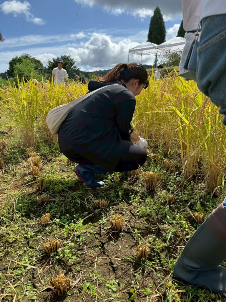 前日の雨でぬかるんだ田んぼ。長靴をはいた学生たちは片手で稲の株をつかんで鎌で刈っていきます。要領よく刈り取っていく学生もいれば、ぎこちない手つきでなかなかはかどらない学生も。蛇や野ねずみの出現に悲鳴があがることもしばしばで、作業は楽しくにぎやかに進みました。