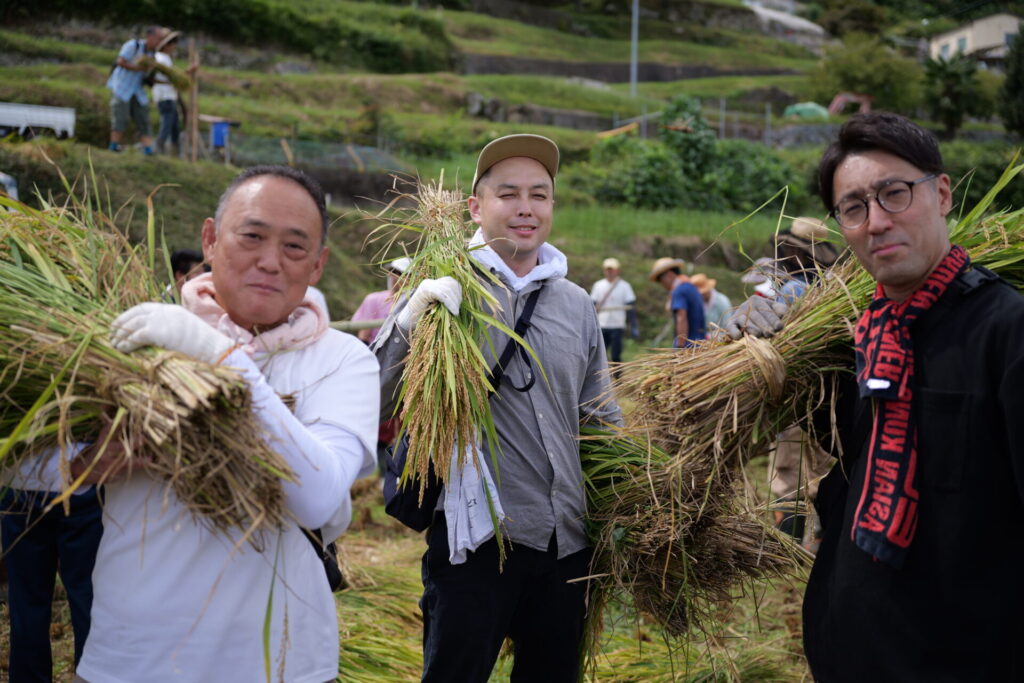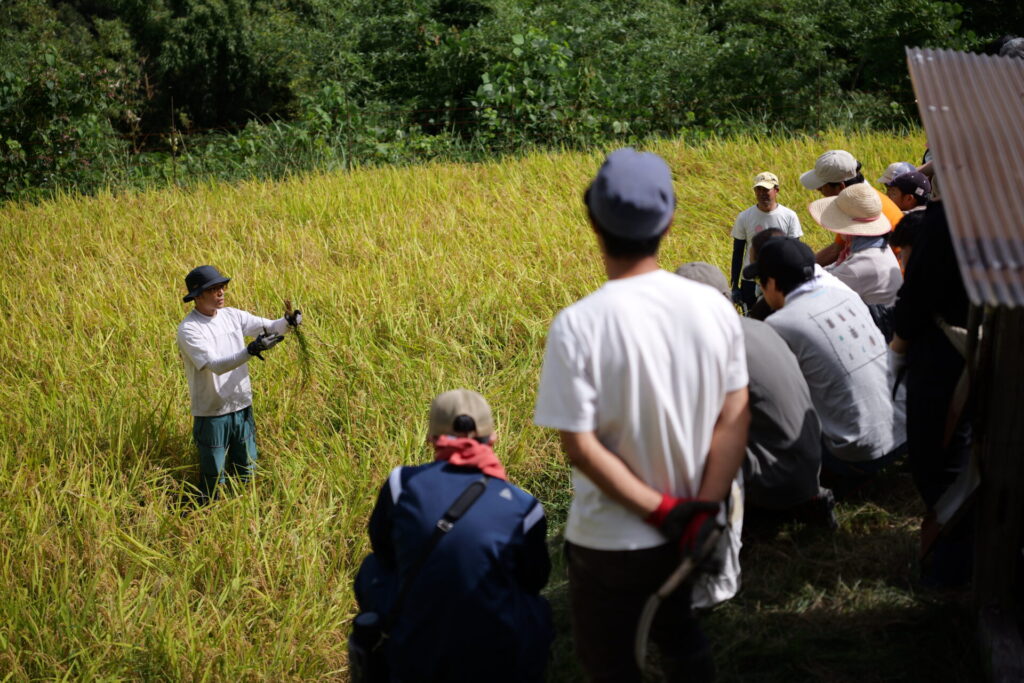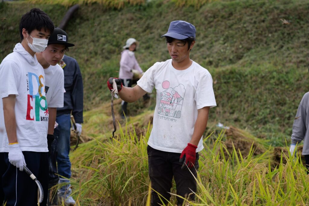 両校はその活動に賛同し、今年度からプロジェクトに参画しています。大阪保健福祉専門学校 社会福祉科学科長の辻林厚先生は「棚田プロジェクトは単なる農作業体験ではなく、地域社会の結びつきを体感し、地域共生や地域創生といった地域福祉の学びを得ることを目的としています。さまざまな方々と交流を深め、高齢化が進み廃れていく地方をどう盛り上げていくのかを考えてほしい」とプロジェクト参画の意義を説明。学生と教職員らは4月の水路掃除や6月の田植えなどに参加し、今回初めての収穫を迎えました。