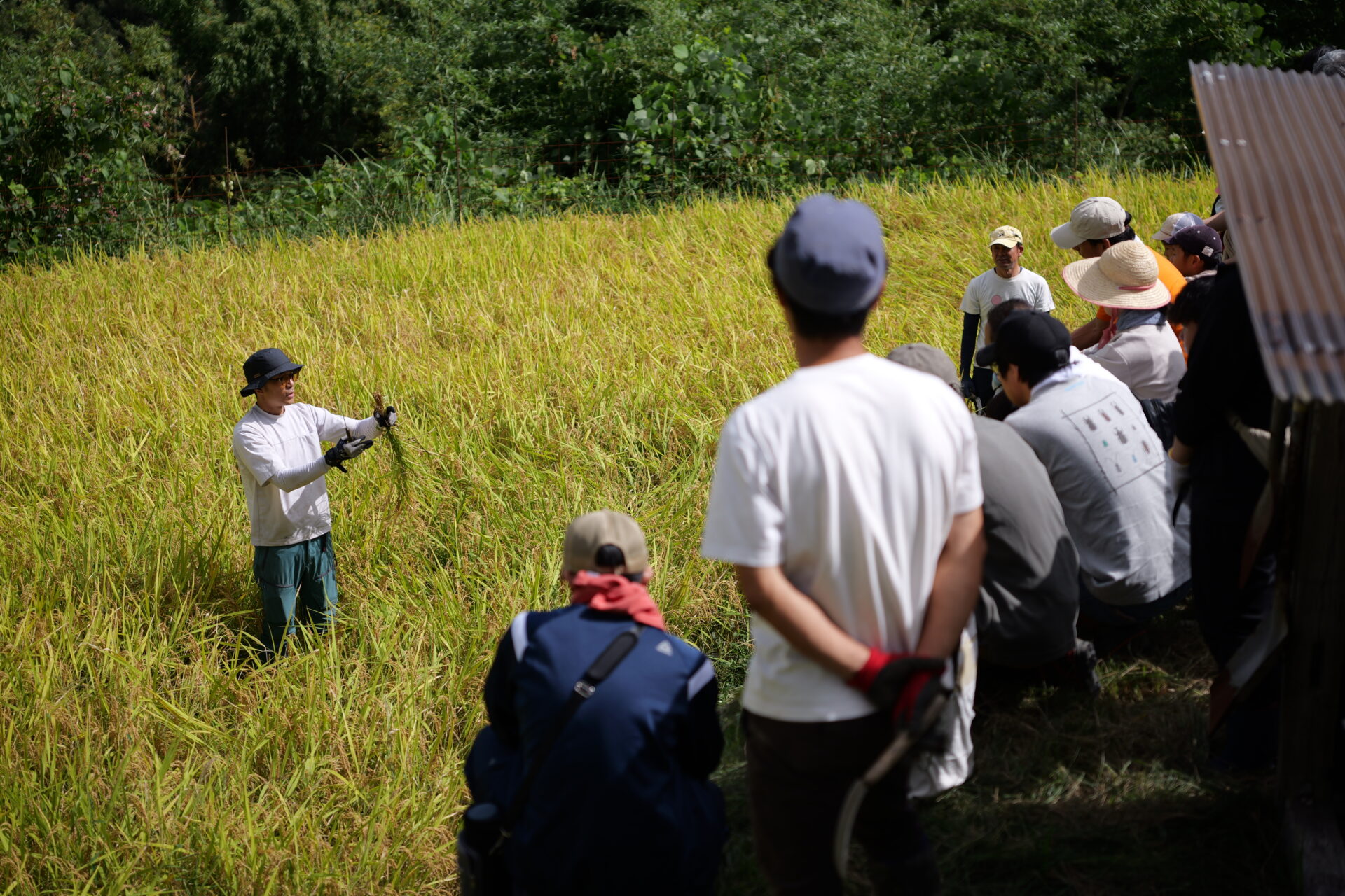 楽しく、にぎやかに稲刈り 最後の3枚、収穫完了