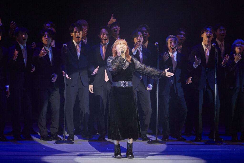 開演にあたり、『明日への扉』の総合プロデューサーで、姉妹校の大阪スクールオブミュージック高等専修学校の喜多静一郎学校長が、このミュージカルのスタートの背景から31年間の歴史と、産学連携教育の一環として始まったことを説明しました。「この『明日への扉』は必須科目として、まず病気について患者さんのお話なども聞いて学びます。そして、自分たちが学んでいる様々な専門知識をどのようにして形にして皆様に感動という形で伝えていくのかや、仕事を通して社会に貢献していくことを勉強してスタートします。その後、各専攻ごとに様々な知識や技術を身につけ、半年間かけて今日の公演にたどり着きます」と、今日の公演に至るまでの説明をしました。また、2025年度のトピックスとして「158の国と地域が集まり、大阪・関西万博が行われました。その中で、海外の方々にぜひご紹介すべきイベントに、この『明日への扉』が選ばれました。そして、6月16日(月)にメインホールのシャインハットにて学生たちが無事に公演を行いました」と、海外からの来場者を含め2,700名もの方々にご覧き、31年目となる2025年に学生が繋いできた『明日への扉』のコンセプトを世界へと発信できたことを報告、この活動を支えていただいた企業の皆様に改めてお礼を述べました。最後に、「31年前に参加した学生たちが、自分たちの思いを1行1行、短冊に書いて言葉を集めました。そして学生が作曲し、ずっと歌い継がれてきたキャンペーンソング『明日への君に』で幕を開けたいと思います」とゴスペルアンサンブルを紹介し、公演の幕があがりました。