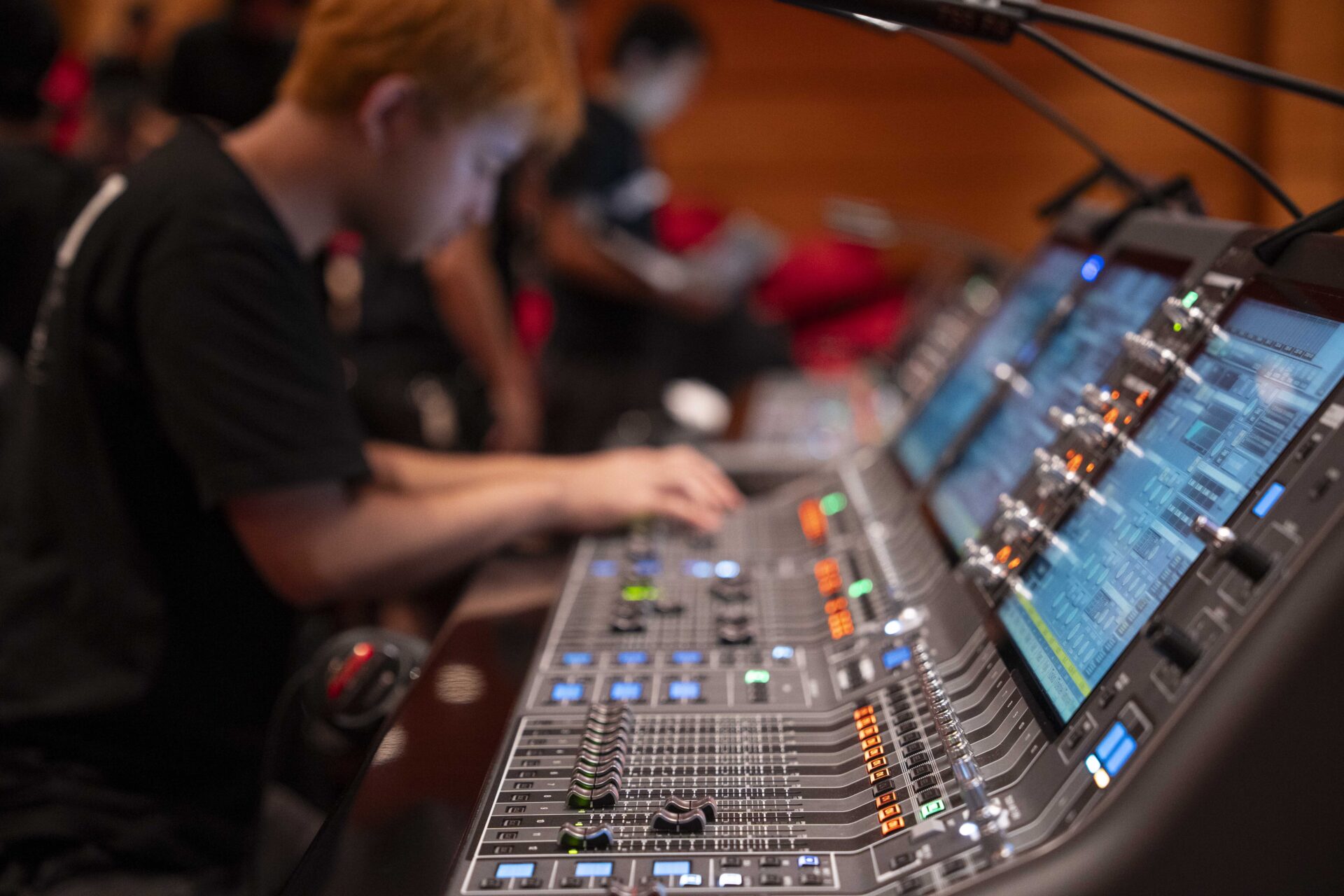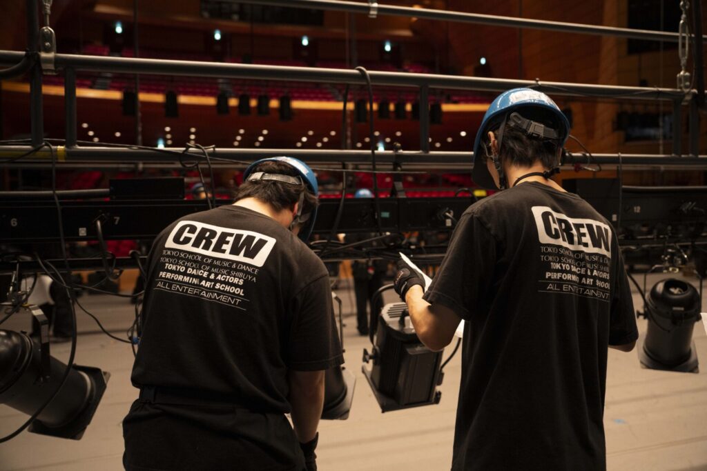 パフォーマンスを支えるスタッフも同様です。難しい生演奏の音響や、プロジェクションマッピングを使用した舞台制作、映像投影のオペレーション、照明など、最新技術を学びながら、感動の舞台を学生たちが作り上げています。