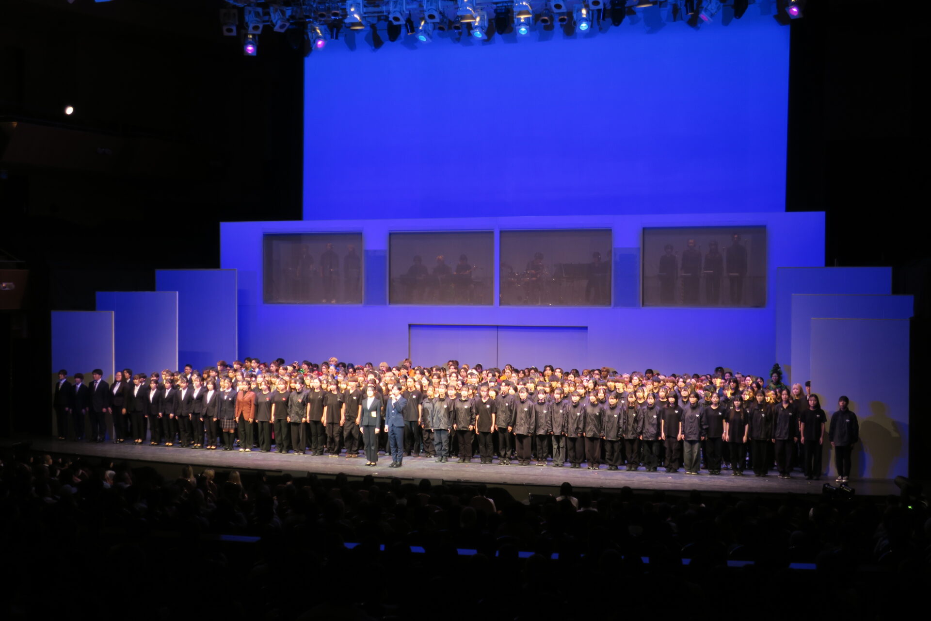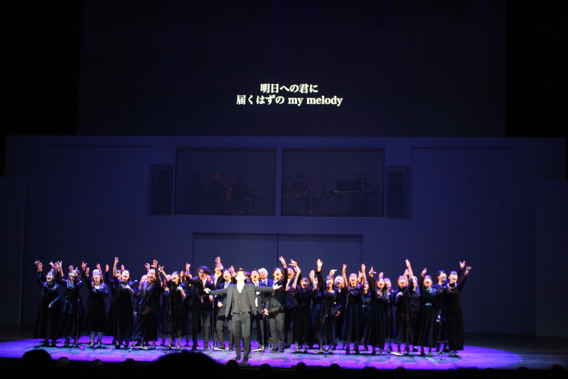 最後に喜多先生は「ミュージカルの初演に関わった学生たちの言葉をひとつずつ紡ぎ、1行1行精査して作った歌です」と30年以上変わらないオープニング曲「明日への君に」を紹介。OSM・DA・OSM高等専修学校Choirの歌声により公演の幕が切って落とされました。
