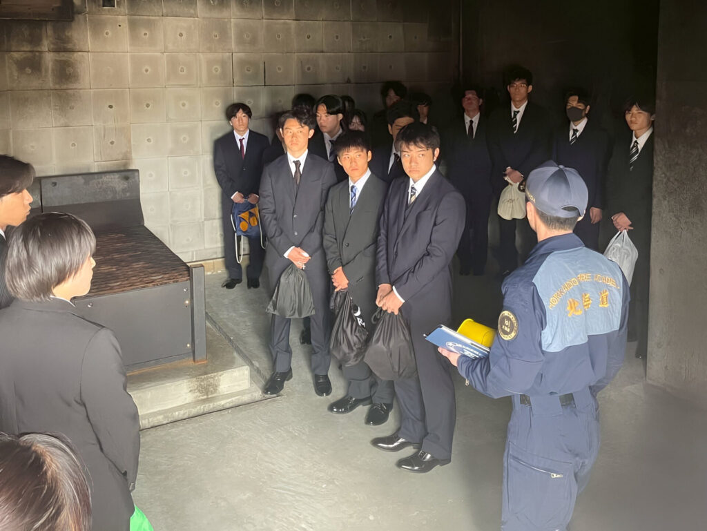 また、倒壊家屋を想定した震災対応訓練施設も見学。この施設では、建物内部に複数の障害を設置し、救助活動の模擬訓練を行うことができます。北海道は地震や風雪被害など自然災害が多い地域であり、こうした訓練環境は非常に実践的です。教官は「災害現場では瞬時の判断と協力体制が不可欠です」と強調されました。学生たちは実際に訓練用資機材を手に取り、装備の重量や構造を確認しながら、救急救命士として求められる連携の大切さを実感していました。