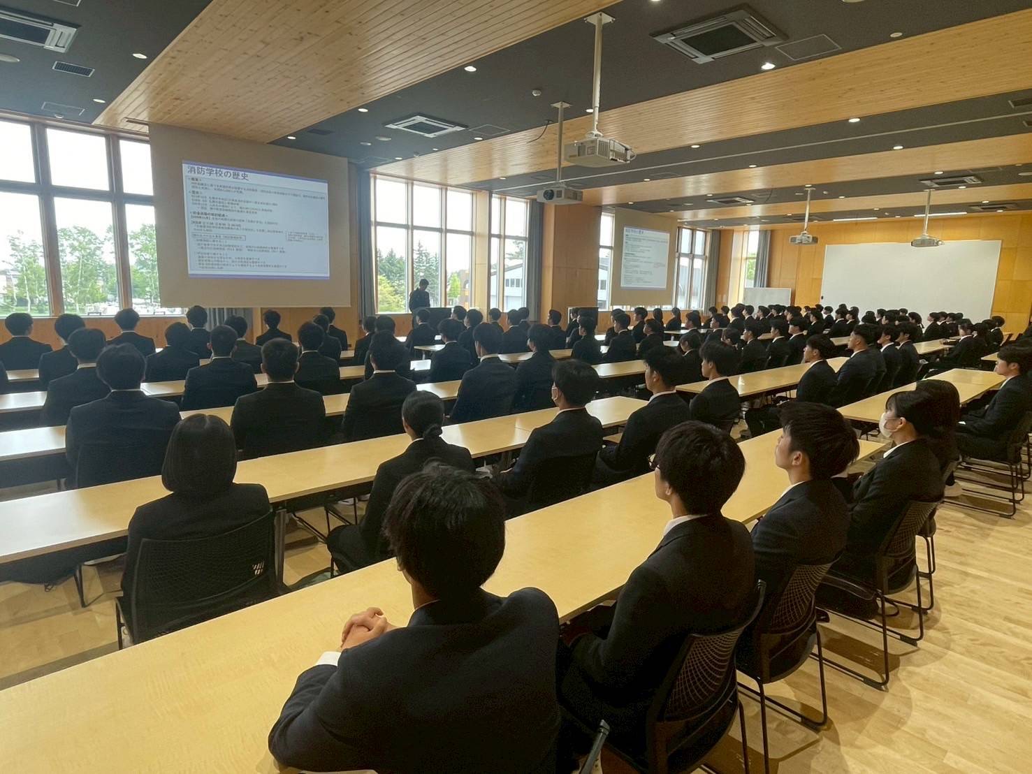 当日は最初に講義室で学校職員の方から施設の概要説明が行われました。消防士として求められる資質や、研修の流れ、安全教育の重要性などが具体的に紹介され、学生たちは配布資料を手に真剣に耳を傾けていました。講話では、入校後に行われる厳格な訓練のスケジュールのほか、協調性・規律を重視する教育方針についても説明があり、教室内は緊張感に包まれました。
