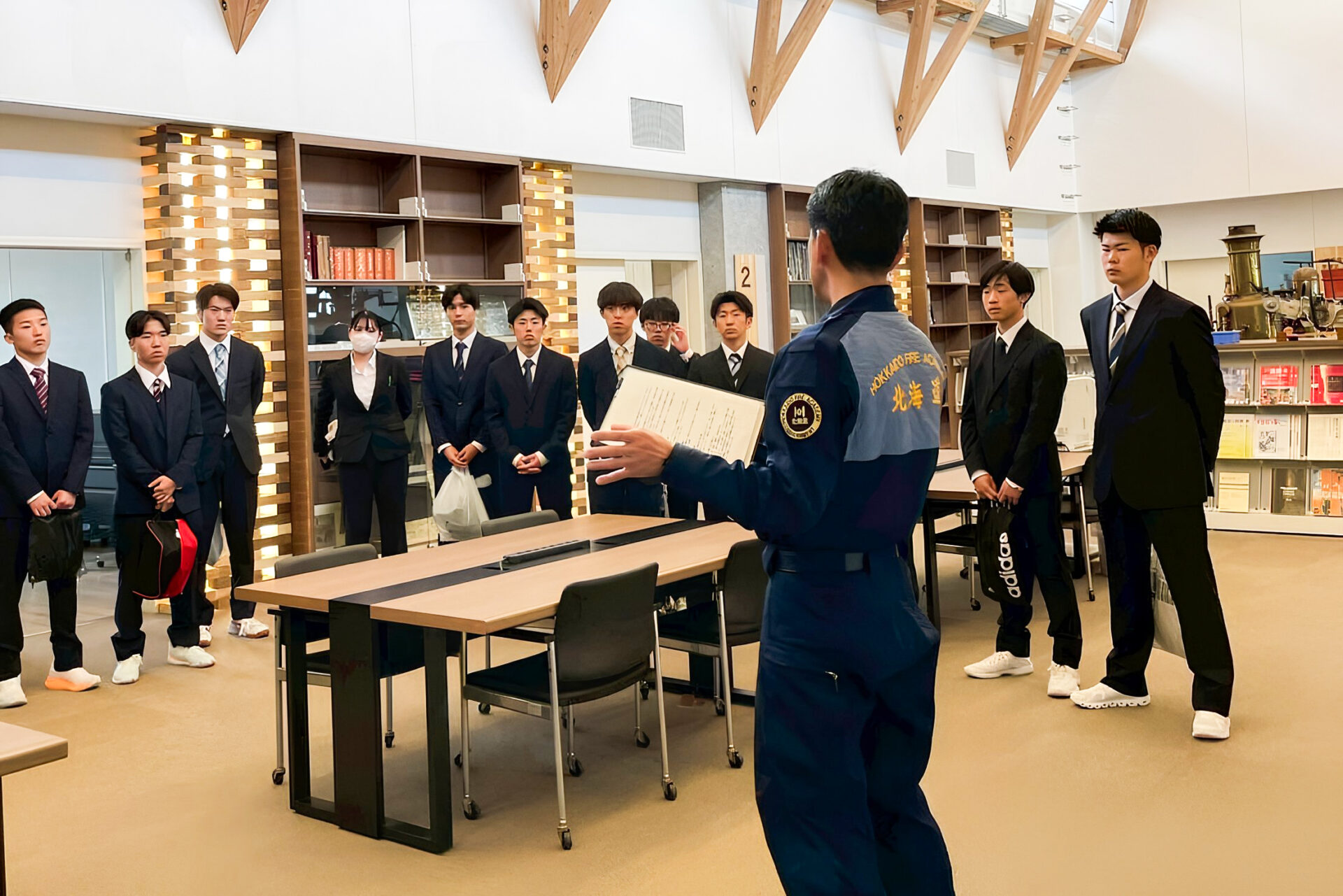 こうした説明を通じて、学生たちは、消防士という職業が単なる体力勝負ではなく、知識・判断力・チームワークを総合的に求められていることを改めて実感。将来、現場で命を守る立場になるために、今の学びがどのようにつながっていくかを考えるきっかけとなりました。