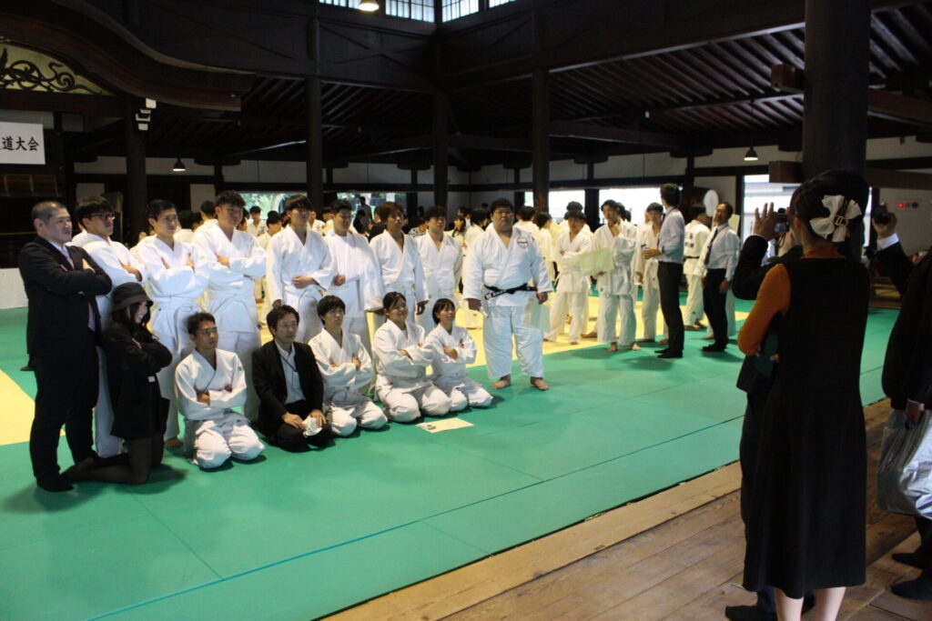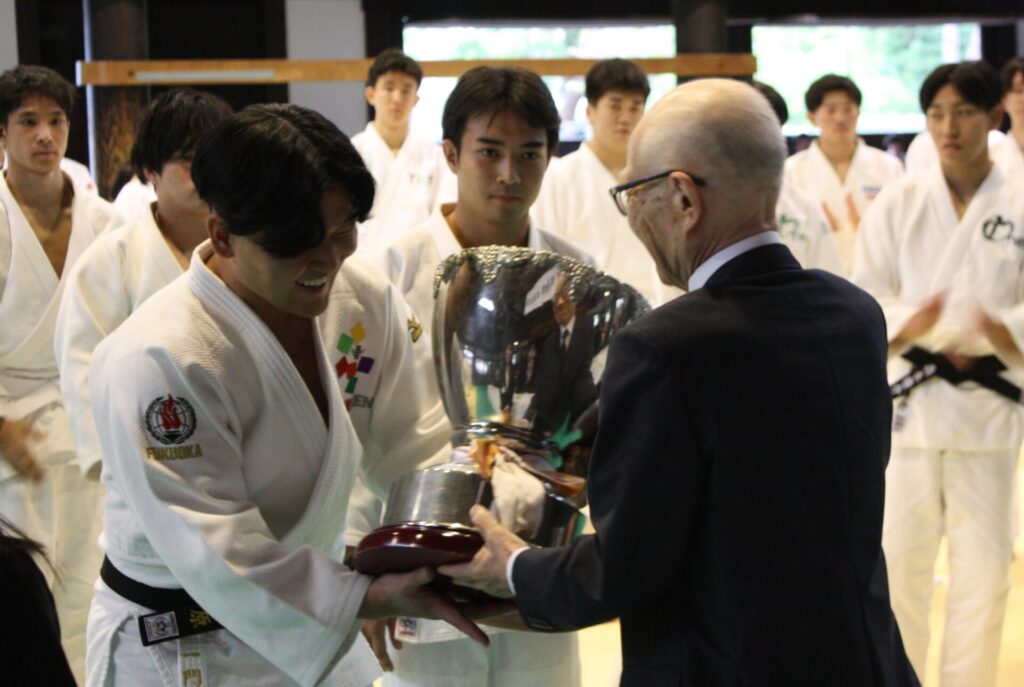 総合優勝に輝いた福岡医健は、男子団体戦の優勝をはじめ、個人戦でも8部門中、半分の4部門で3位以内の入賞者を出し、特に男子未経験者78kg超級では、3選手が1、2、3位を独占しました。総合優勝は、優勝者がいなくてもチームの総合力と愛校心を高めるという趣旨で2009年の第5回大会から導入され、以来、京都医健が12連覇を果たしましたが、昨年、福岡医健がそれにストップをかけ、今回、2連覇を達成しました。