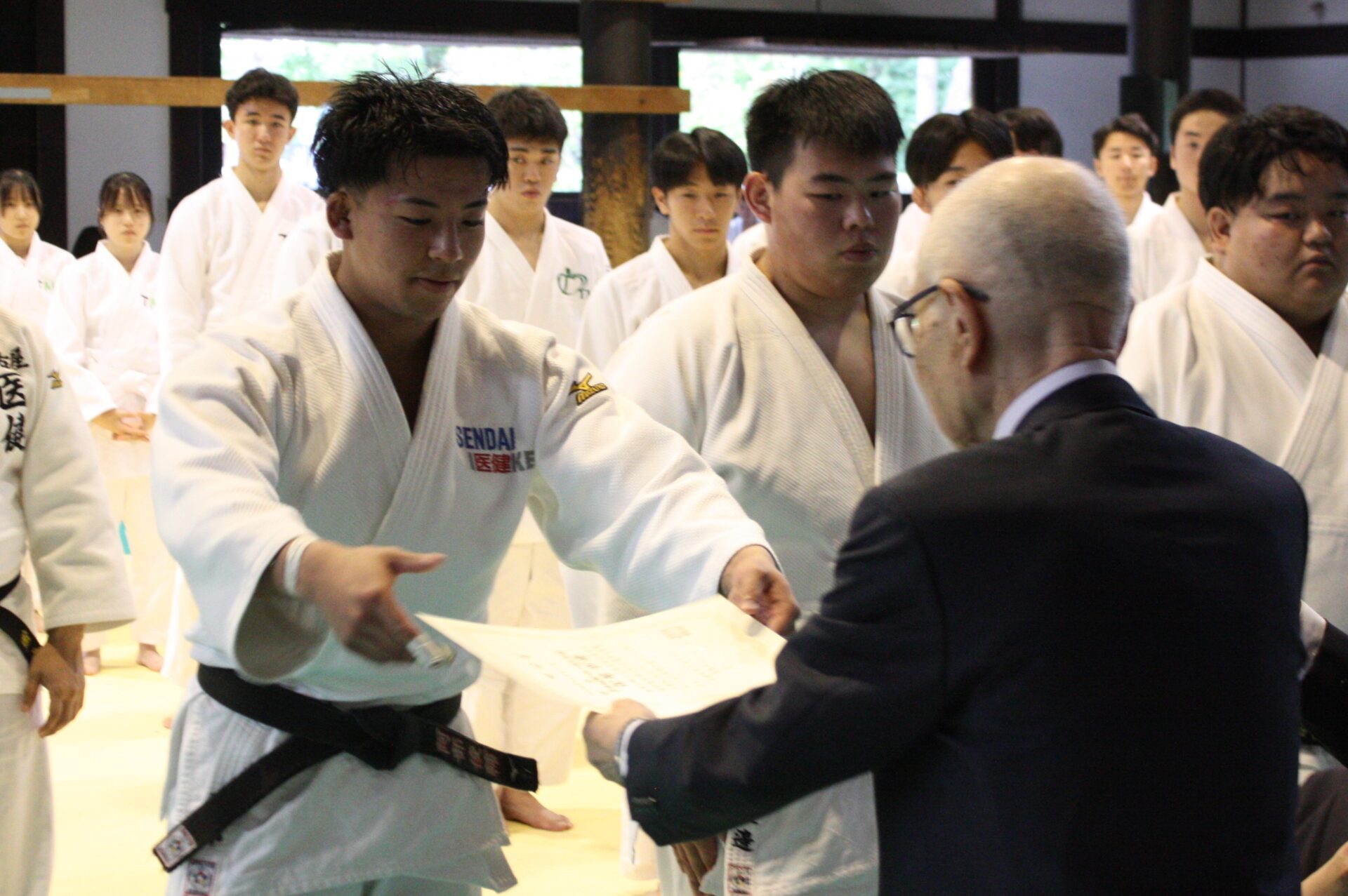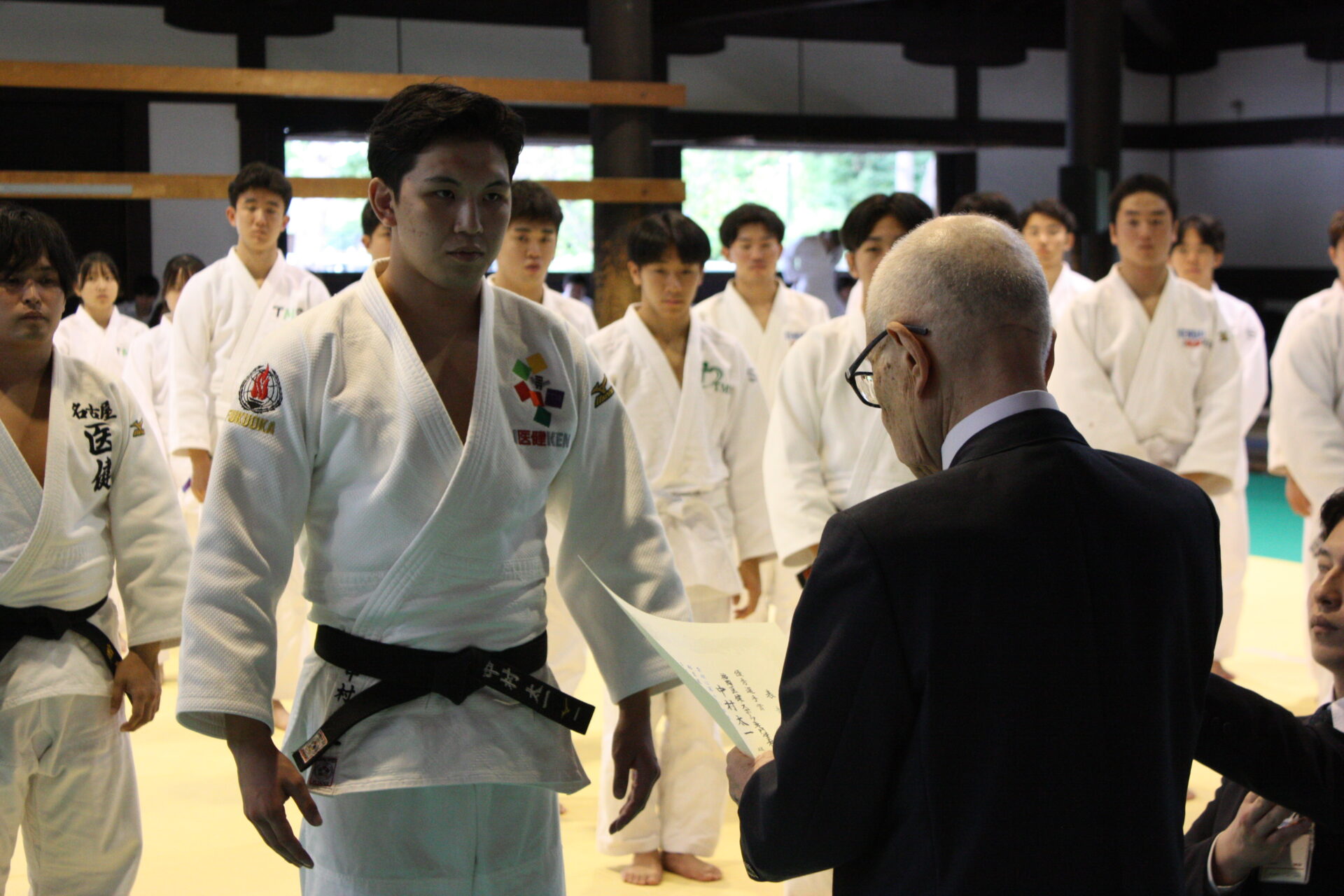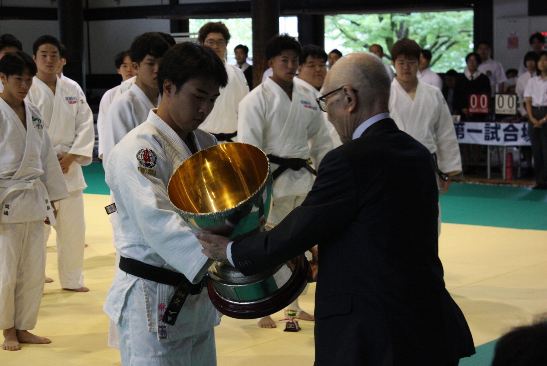 そして、仙台医健・スポーツ専門学校Aと福岡医健・スポーツ専門学校Aの顔合わせとなったクライマックスの団体戦。大将戦で福岡医健Aの中村太一選手が、男子経験者弐段以上の部の覇者、仙台医健Aの阿部俊輔選手との激闘を制し優勝を決めました。