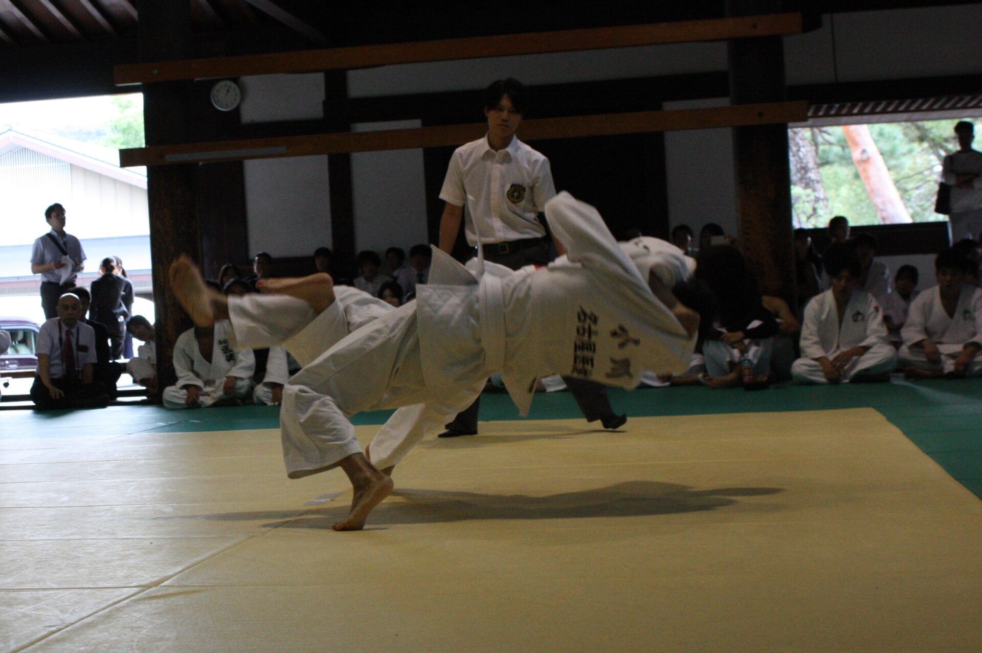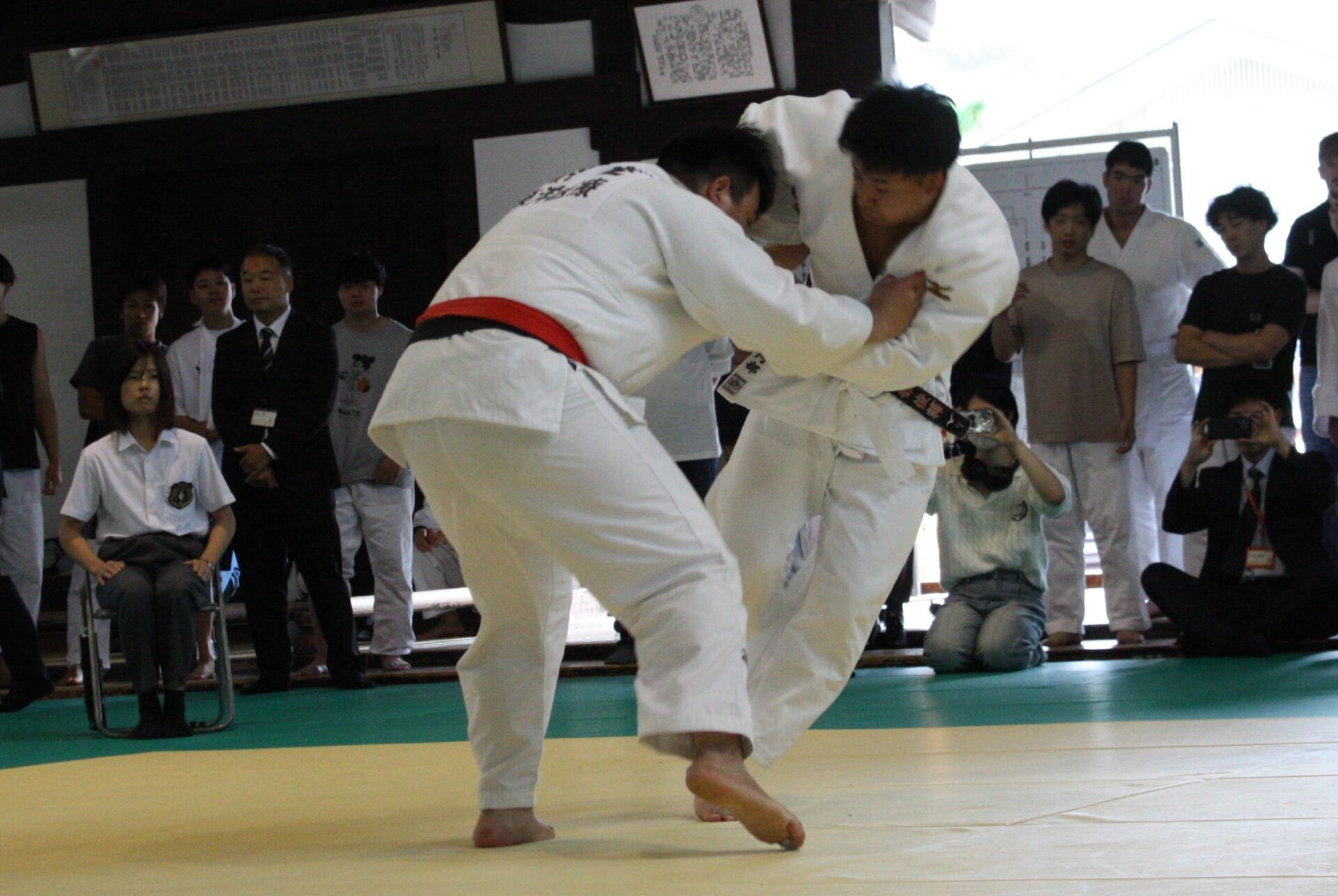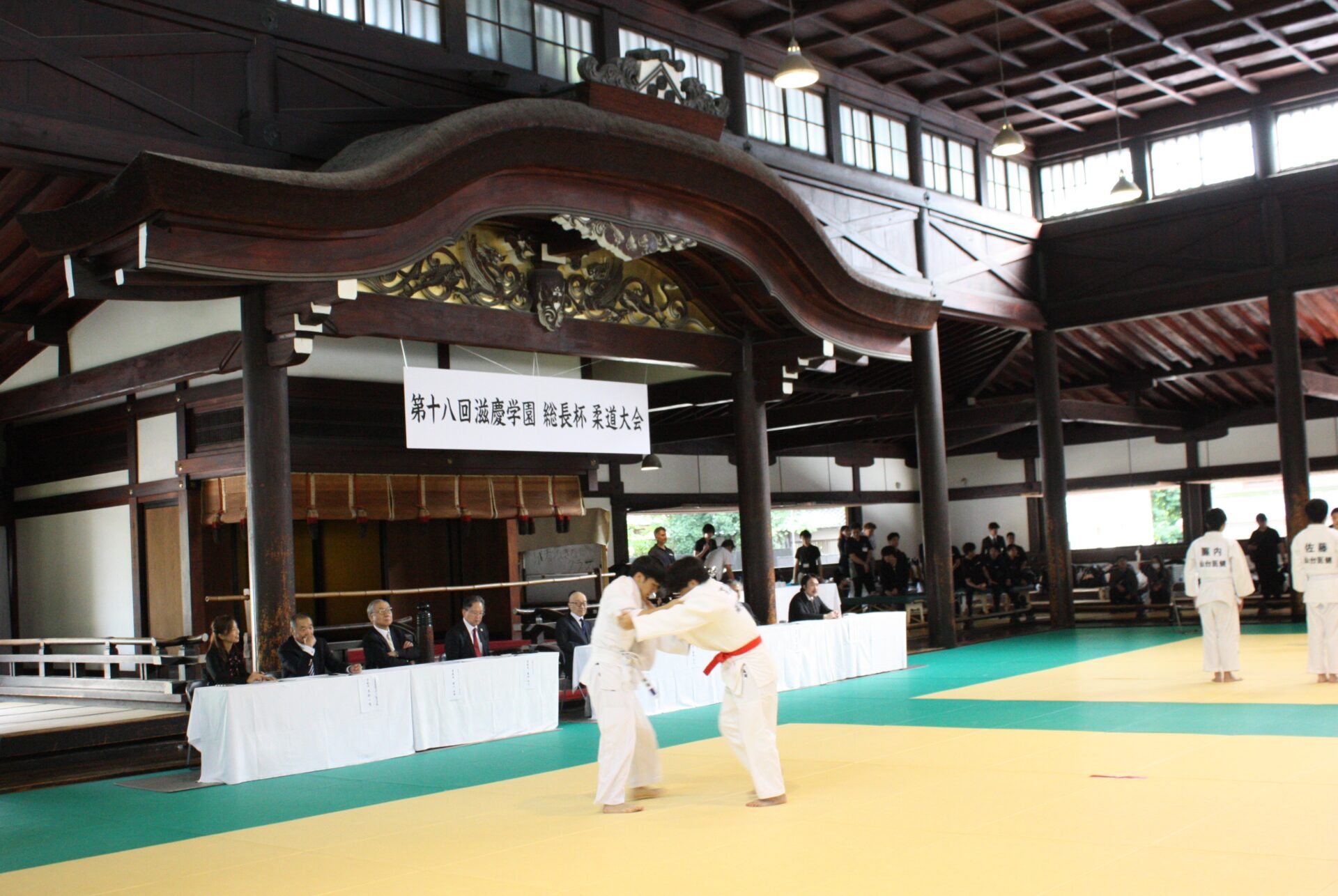 会場の京都市武道センター旧武徳殿は、平安遷都1100年記念事業の一環として明治32年(1899年)に営造された日本最古の演武場で、国の重要文化財に指定されている武道愛好者の聖地。高貴な方が観覧される台覧席が中央に備えられ、厳かな雰囲気を醸し出しています。