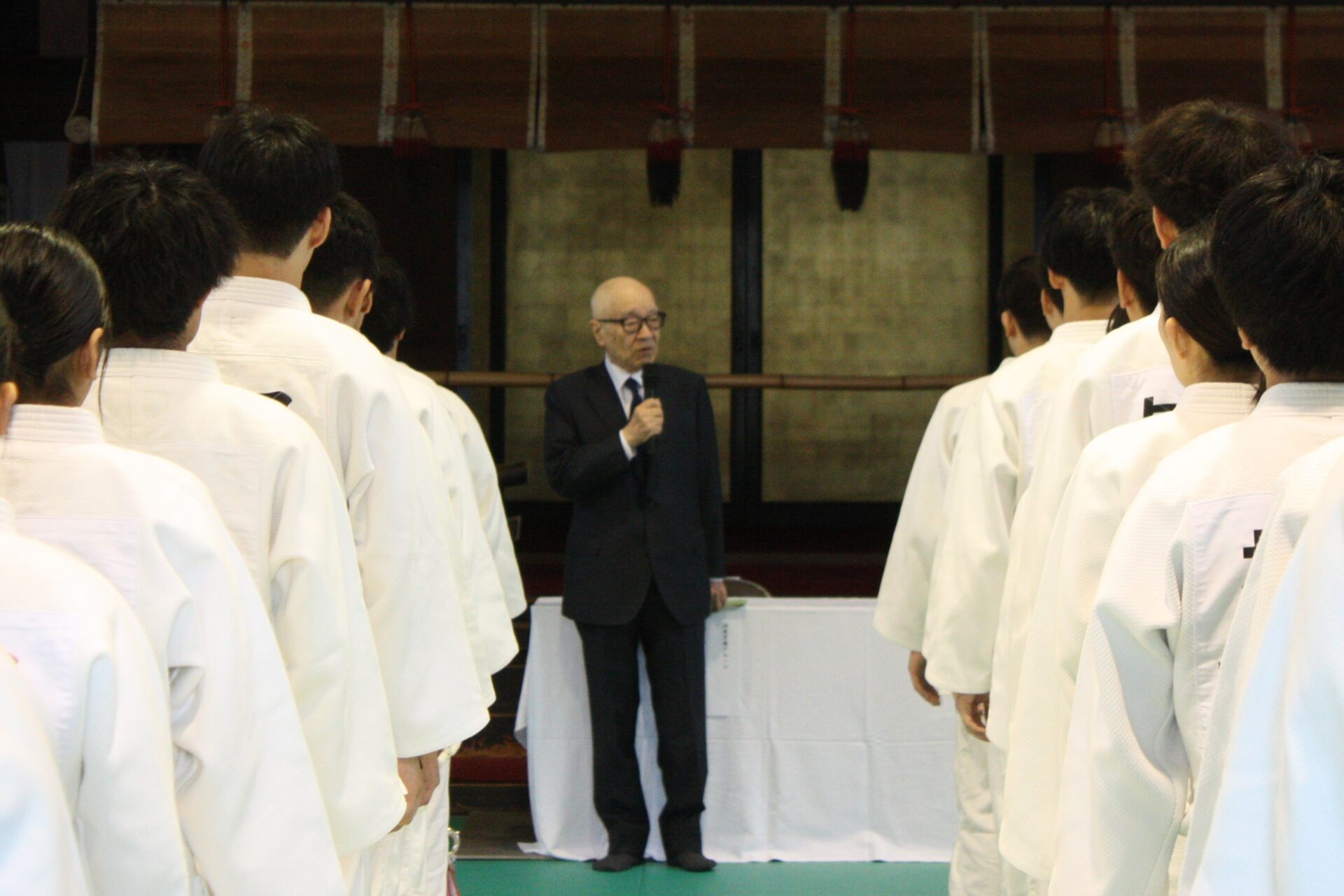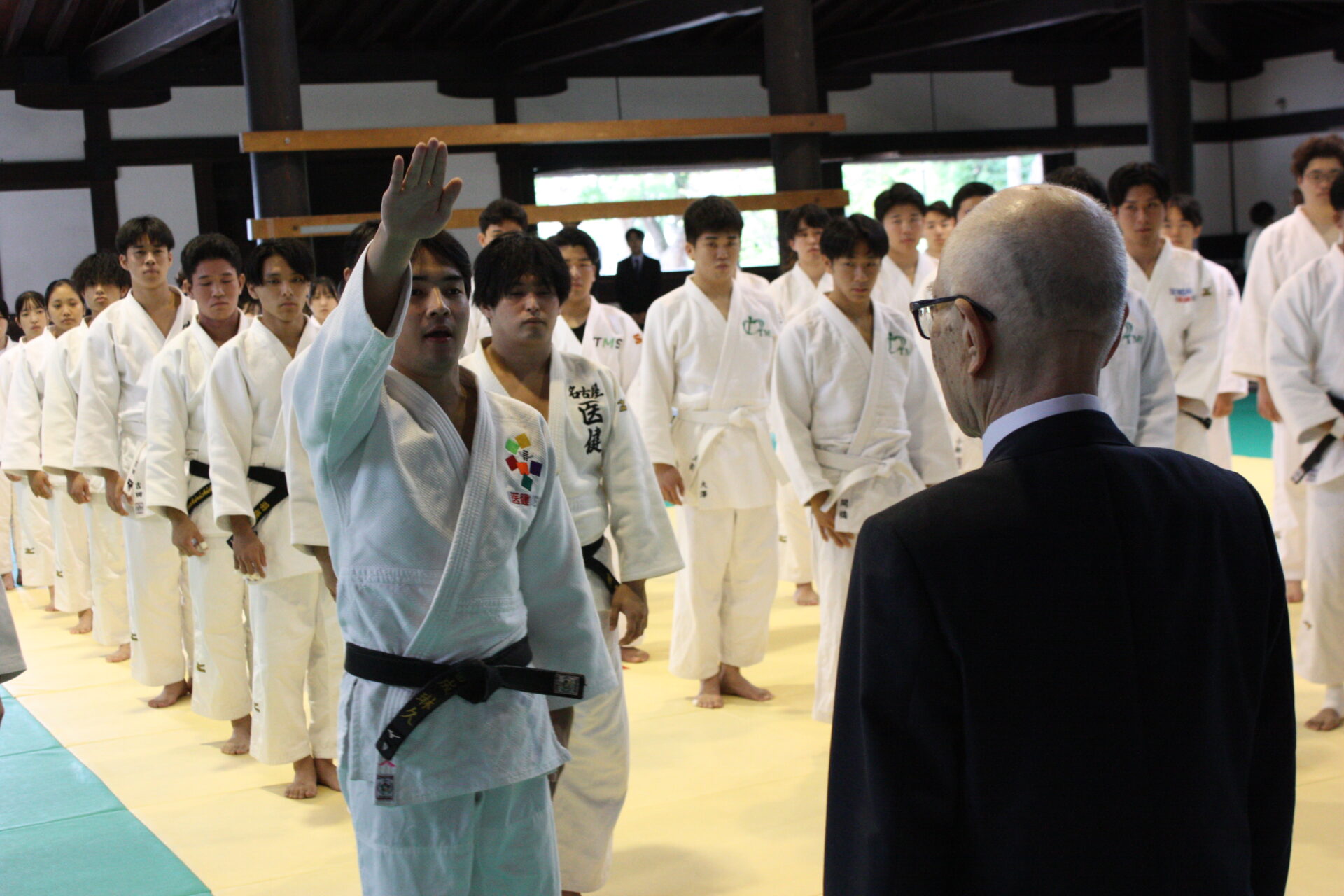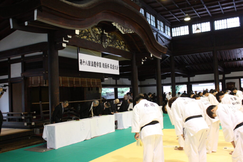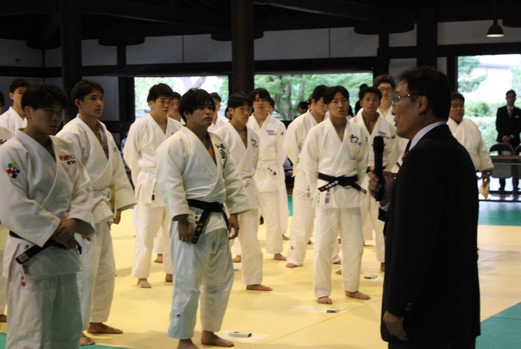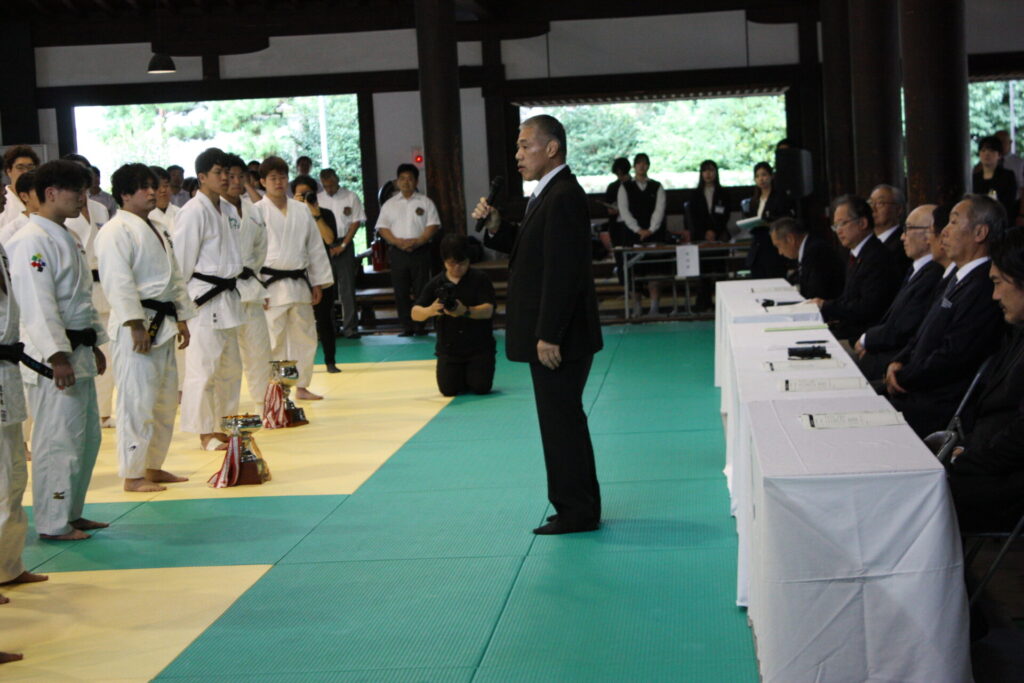 開会式では、藤田裕之・京都医健専門学校学校長の開会宣言に続き、大会会長を務める滋慶学園グループの浮舟邦彦総長があいさつに立ち、「今回は久しぶりの旧武徳殿での開催となります。皆さんは柔道整復師として医学、医療の知識、技術を理解するとともに柔道の基本である『心』『技』『体』をしっかりと磨くことが大切です。また『道』『禅』『行』の精神性も学び、『礼』『儀』を大切にし、仲間との『チームワーク』を深めていただきたいと思います」と語りました。