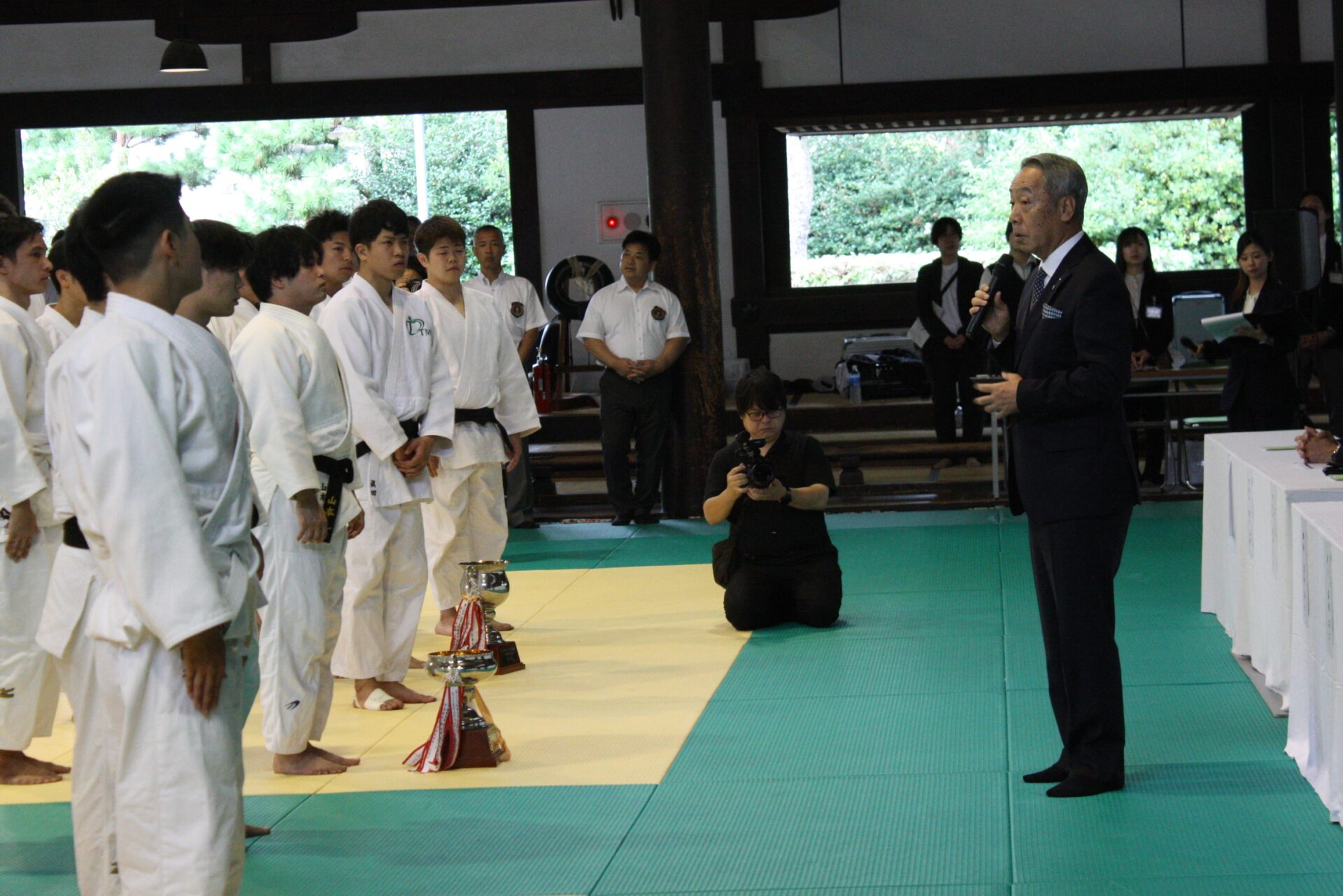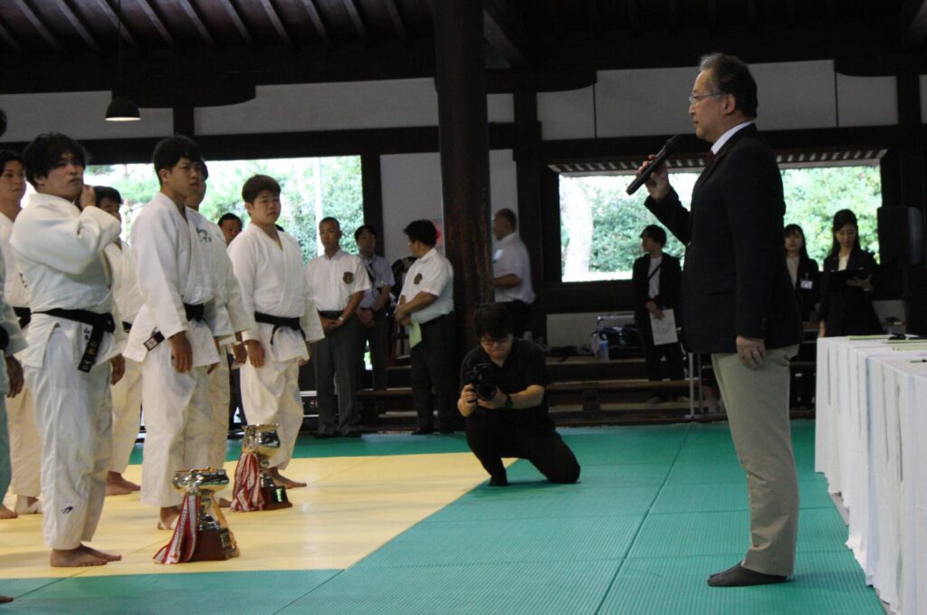 閉会式では、大会会長の浮舟総長から入賞した選手一人ひとりに表彰状とメダルが授与された後、世界選手権4連覇を達成し、元国際柔道連盟A級審判員でもある大会審判長の藤猪省太先生(柔道藤猪塾塾長)から講評をいただきました。藤猪先生は「素晴らしい柔道を見せてもらいました。特に未経験者の部の選手の皆さんは、思い切りがよく、創意工夫もされた柔道をしていました。何事にも初心を忘れずに向かっていく姿勢が大事だと感じました」と選手たちを称え、「また明日から精進してください」と激励しました。