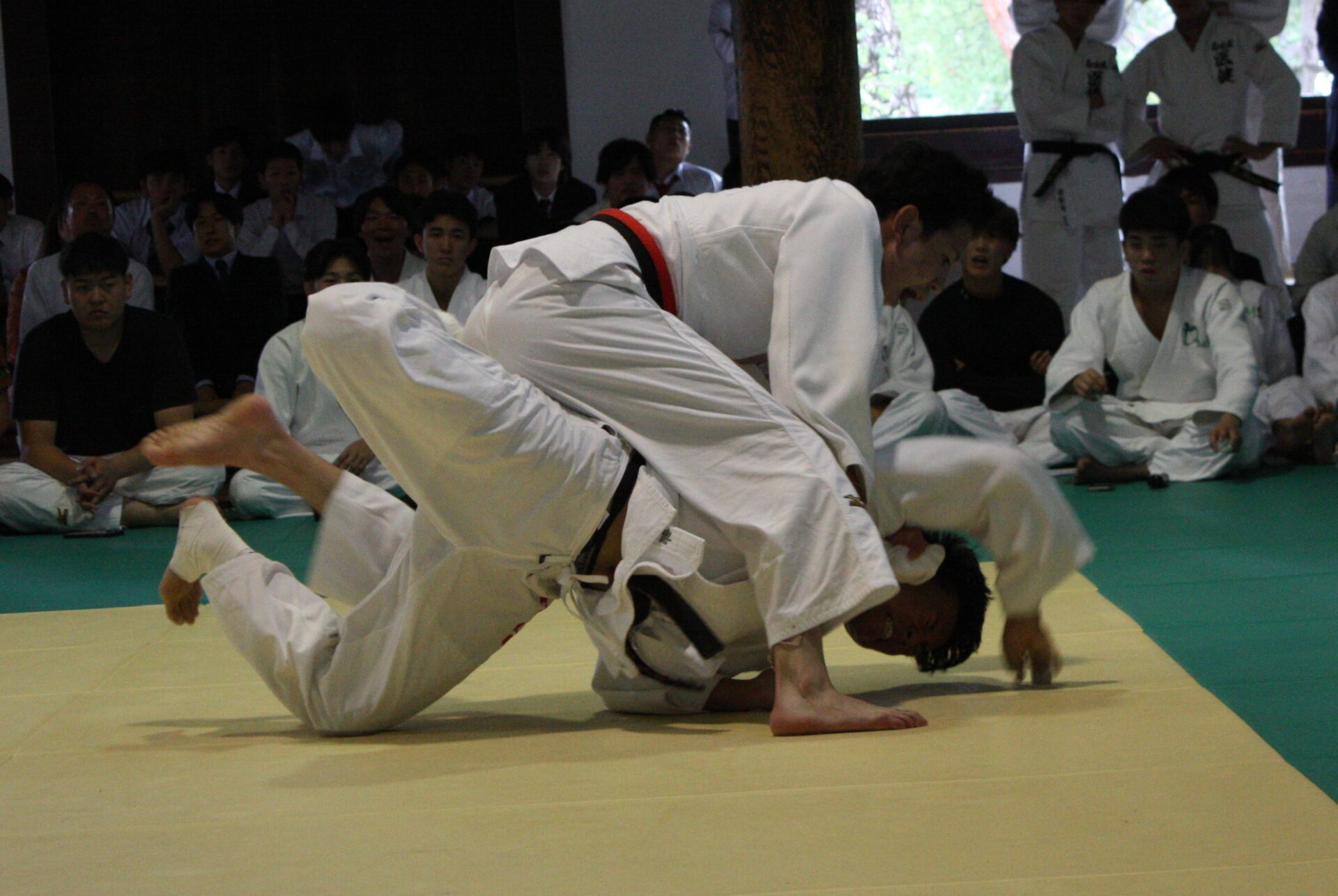 試合は2面を使って左右2ブロックに分かれて各クラスの予選が行われ、予選を勝ち抜いてきた者同士がぶつかる決勝戦は午後に順次行われました。試合時間は3分(延長戦は2分)。観客席の応援団からは「もっと動け」「その調子だ」「耐えろ」などと盛んに声援が飛び交いました。また、会場の一角には救護班の学生たちが待機。負傷した選手に応急手当を施していました。この大会は柔道整復師を目指す学生たちにとって、柔道の試合だけでなく、現場で施術の経験を積む実践の場でもありました。