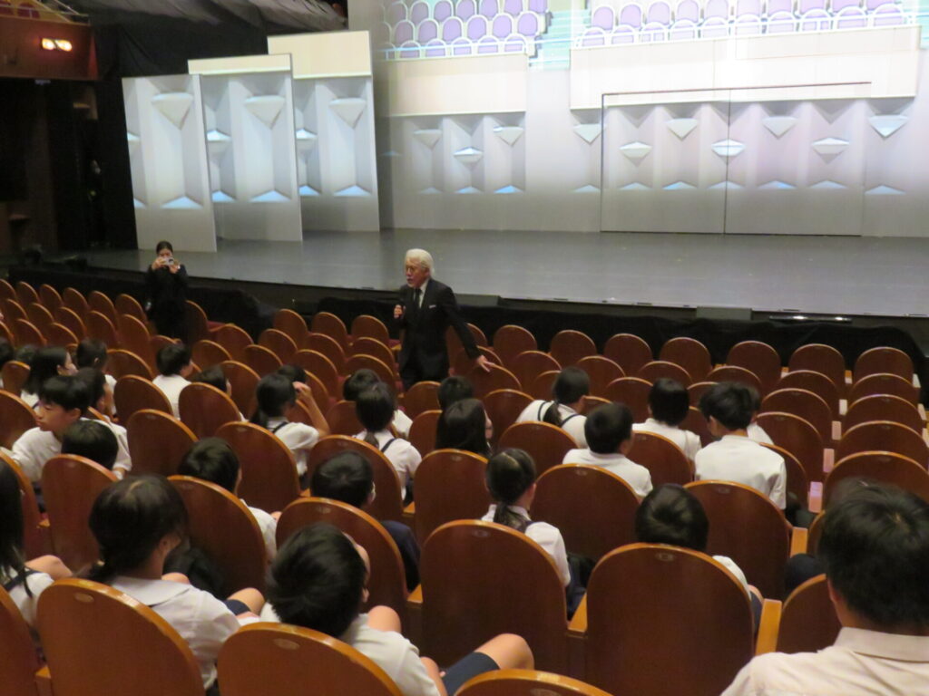 ミュージカルという舞台芸術について、喜多先生は「配役はもちろん、歌唱、ダンス、音楽や、照明、音響、チケット、案内などたくさんの種類のお仕事が関わっています。ミュージカルは多くのエンターテインメントの中でも、一番たくさんの仕事のプロたちで成り立っているのです」などと説明しました。
