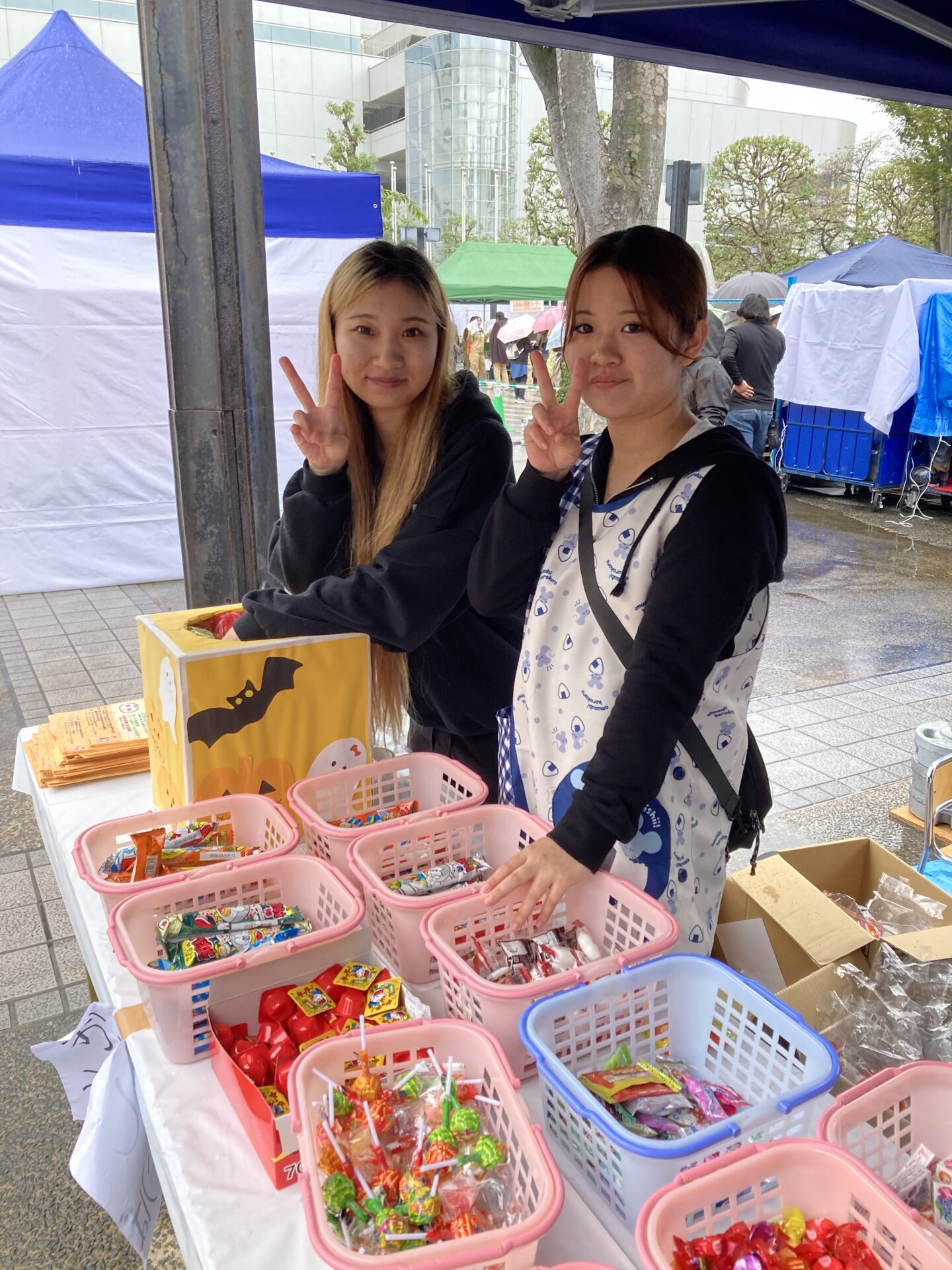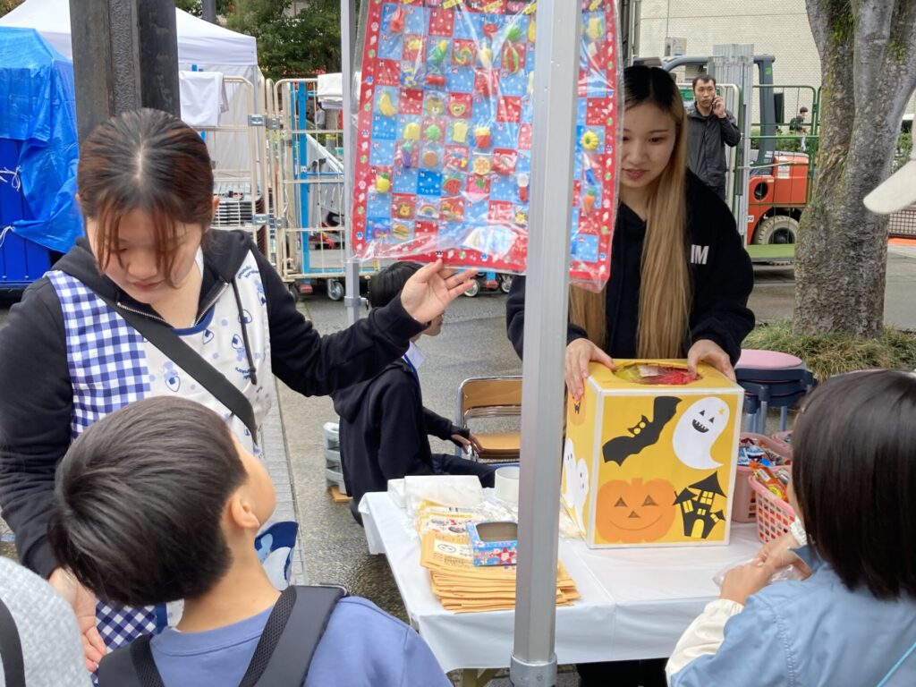 当日はあいにくの雨模様で、時折強く降る時間もありましたが、それでも約200名もの子どもたちがブースを訪れてくれました。本校はこのイベントで毎年、小学生を対象とした「だがしや楽校」というブースを出展しています。今年も子どもたちが「お仕事体験」を通して通貨を受け取り、その通貨を駄菓子と交換できるという仕組みで、遊びながら働くことの意味やお金の大切さを学ぶ内容となりました。