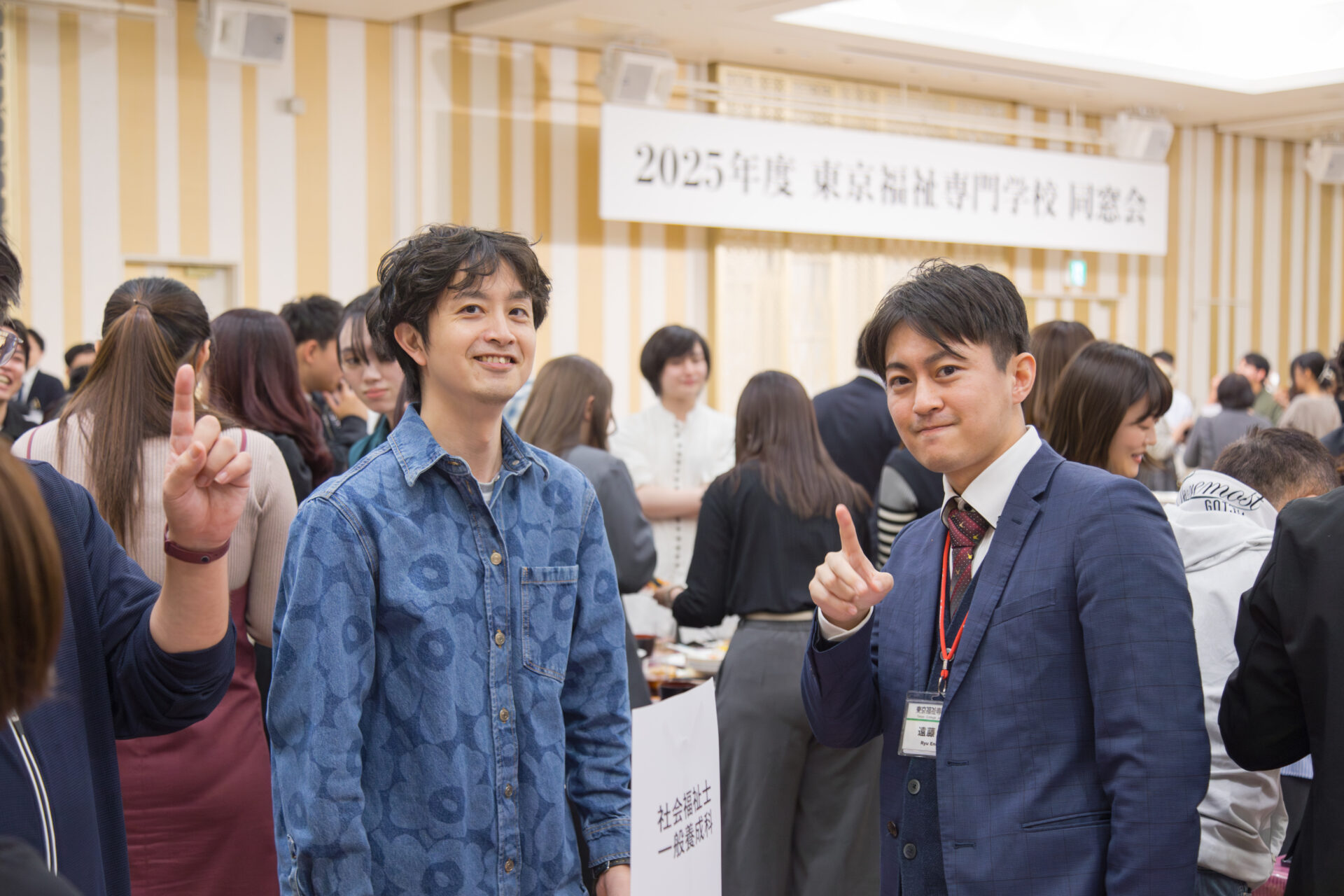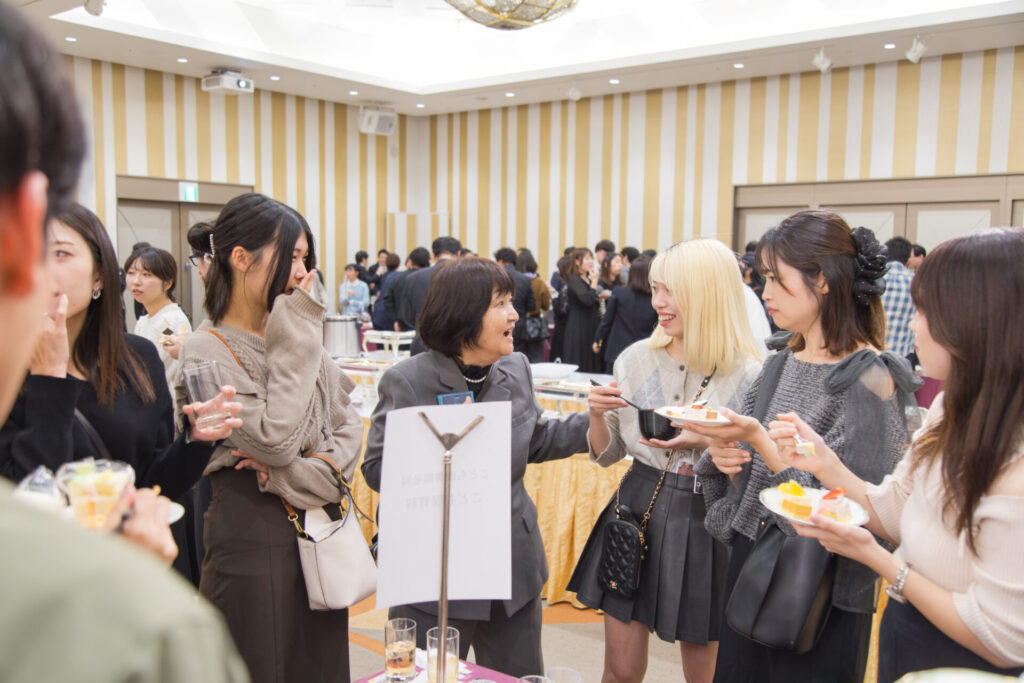 第2部は東京ベイ舞浜ホテル ファーストリゾートに会場を移し、懇親会を開催しました。当時の講師や担任との再会を喜ぶ姿や、卒業学科や分野の垣根を越えた卒業生同士の交流が活発に行われ、和やかな雰囲気に包まれました。懇親会の最後は、卒業生と職員によるスピーチ。東京福祉専門学校への感謝の気持ちや、今後の同窓会発展への願いが語られ、会場は大きな感動に包まれました。