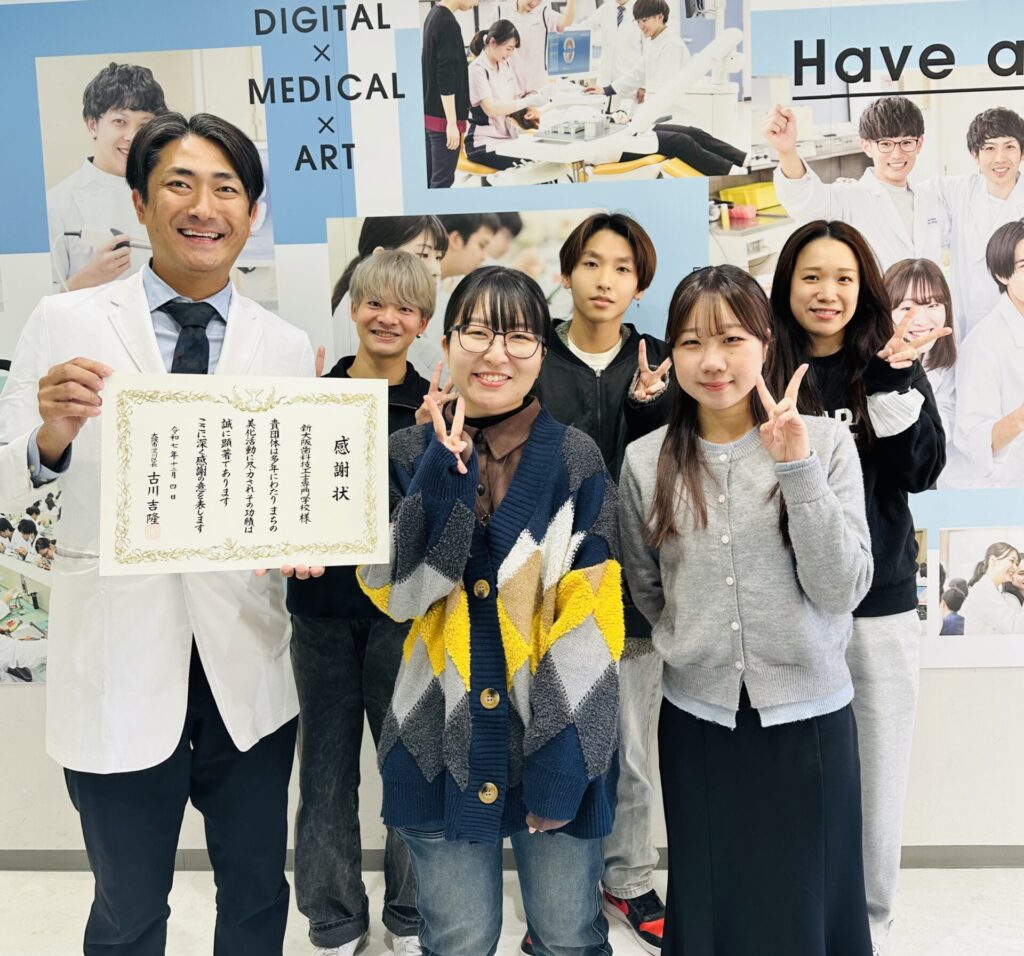 新大阪歯科技工士専門学校では、歯科技工士という専門職になるための学びと同時に社会貢献の精神を育むため、学生と共に地域清掃活動をボランティアの一環として約20年にわたり継続してきました。そんな日頃の地域清掃活動が評価され、12月4日(木)、大阪市淀川区から令和7年度 大阪市美化運動・功労者表彰を受けました。