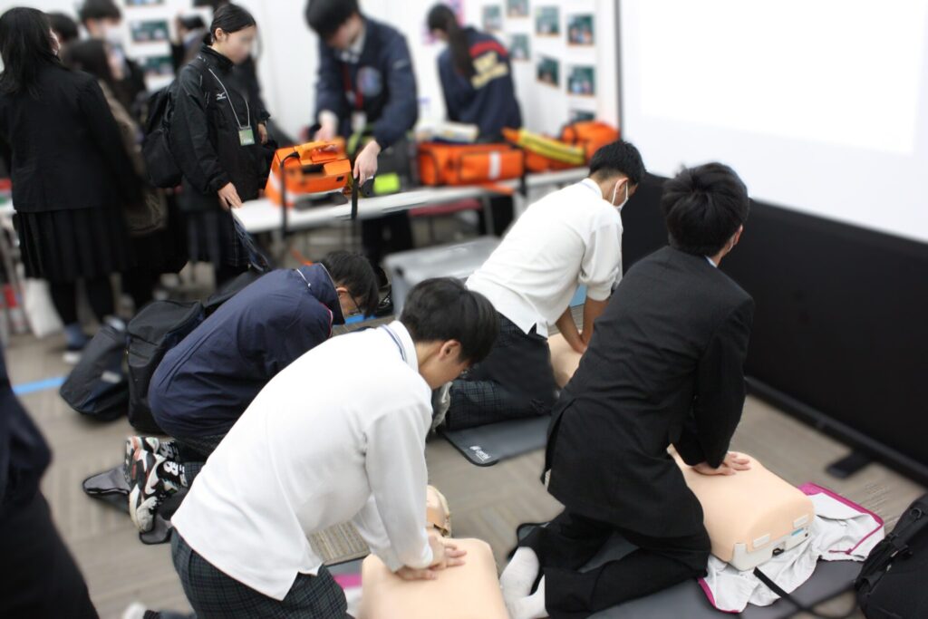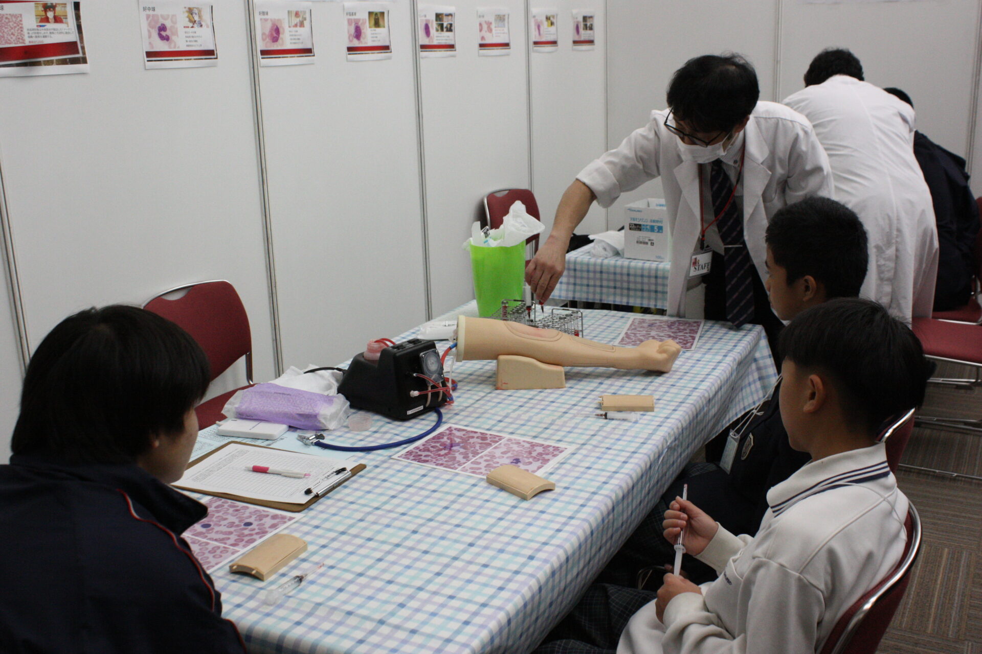 人命救助に尽力する救急救命士。ブースを訪れた生徒たちは、等身大の人形を使って心臓マッサージをする体験をしました。検査のスペシャリストとして活躍する臨床検査技師の体験コーナーでは、血液検査・細胞検査をについて学び、模型を使って採血のシミュレーションをしました。