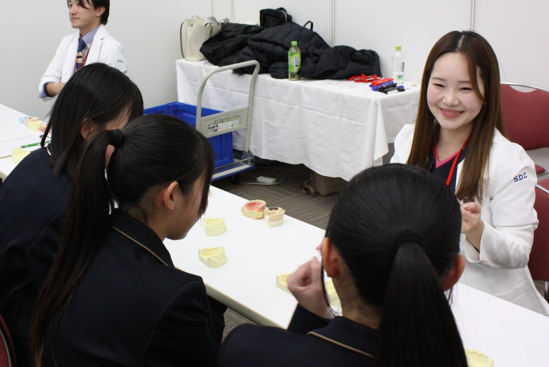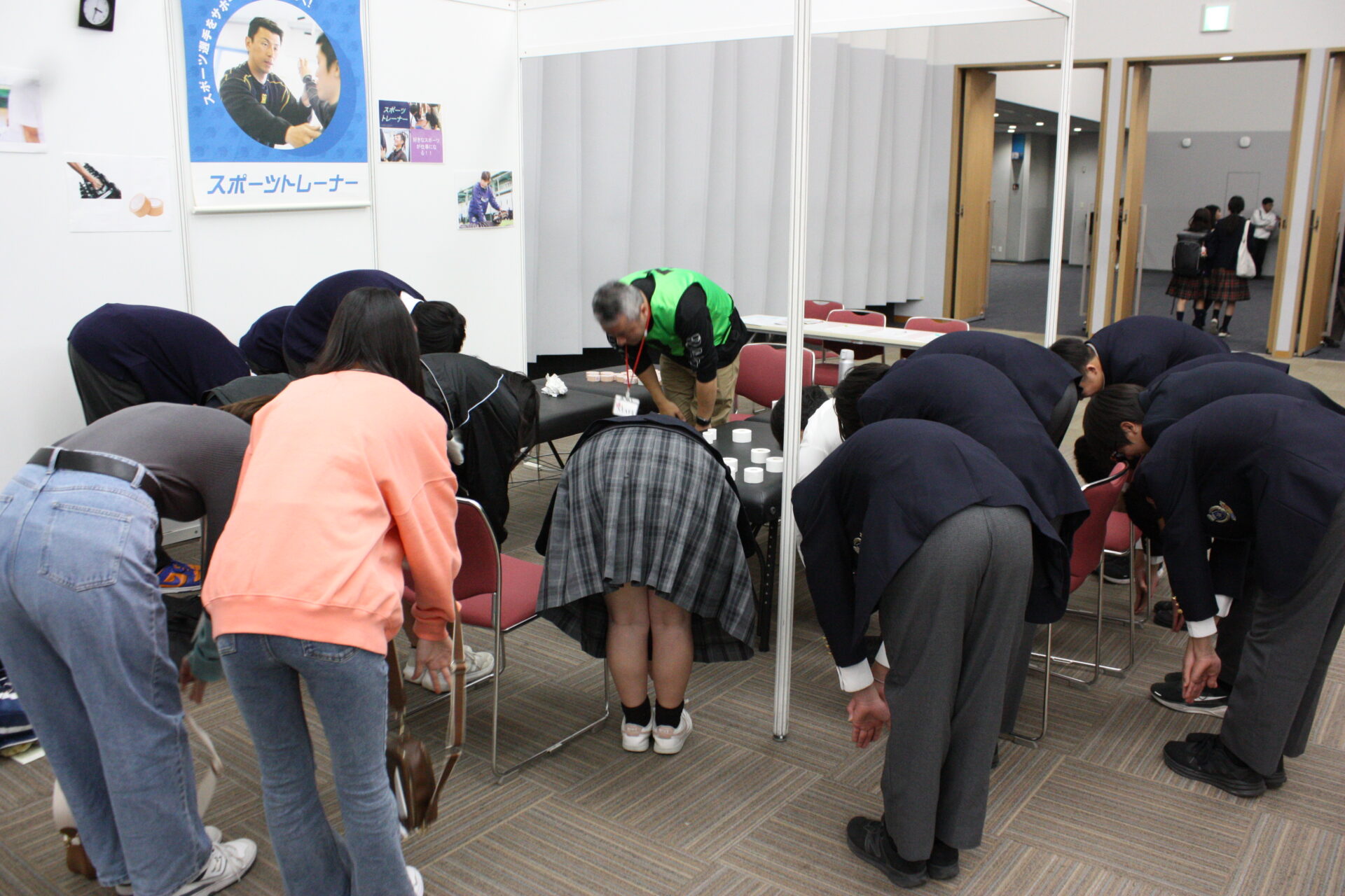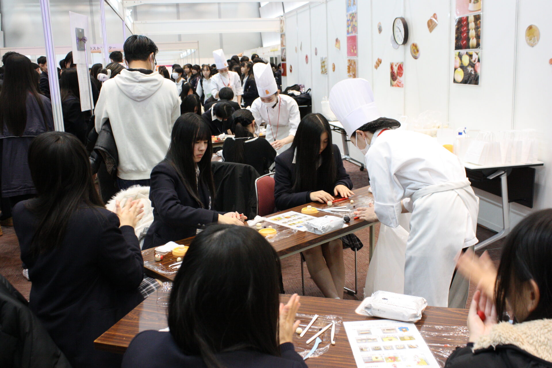 このほかスポーツトレーナーの体験ブースでは、スタッフが示すお手本を見ながらストレッチで身体をほぐしました。パティシエの体験では、多くの女子生徒たちが学生スタッフや専門学校の先生の指導で、思い思いのデザインのマジパン作りを楽しんでいました。