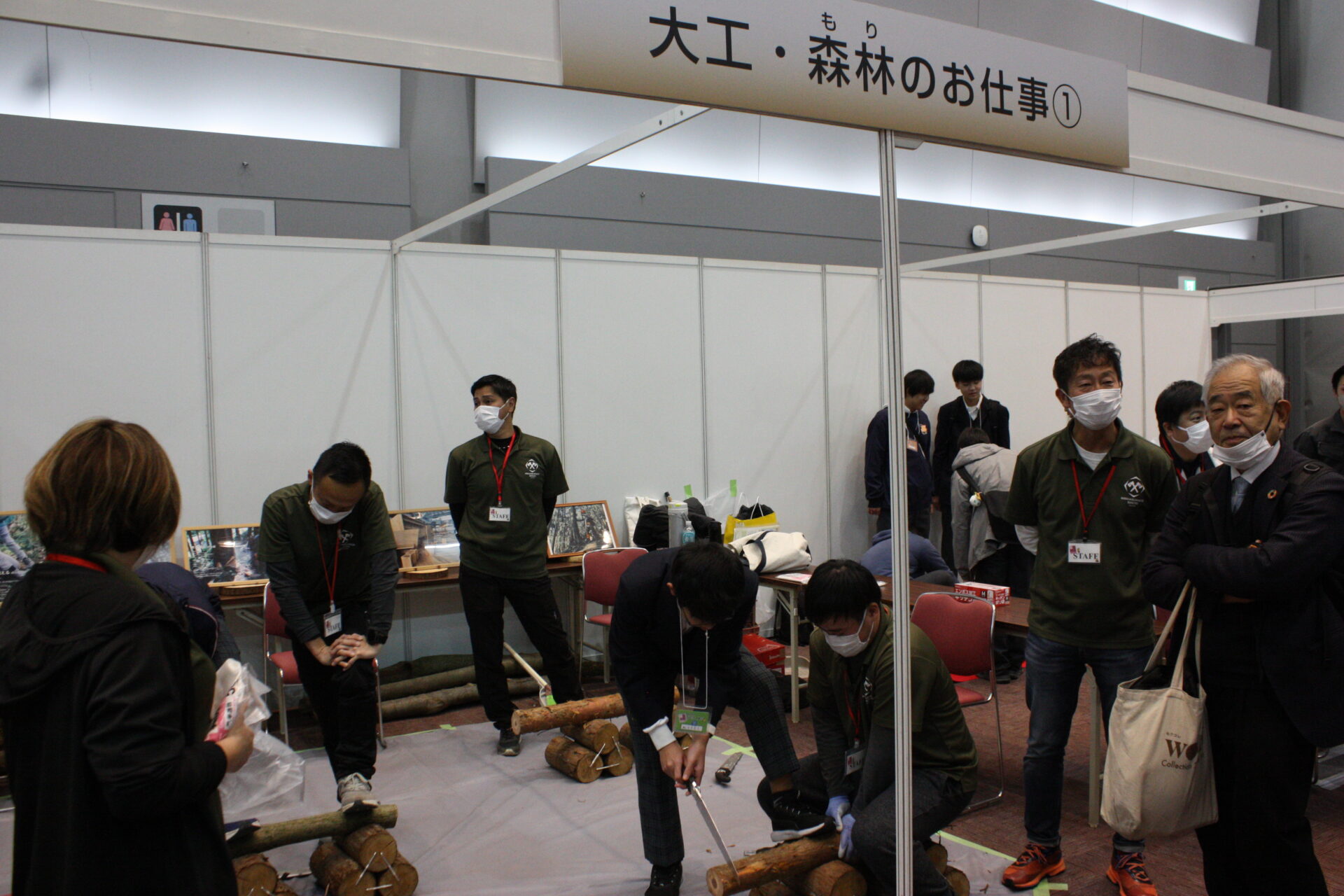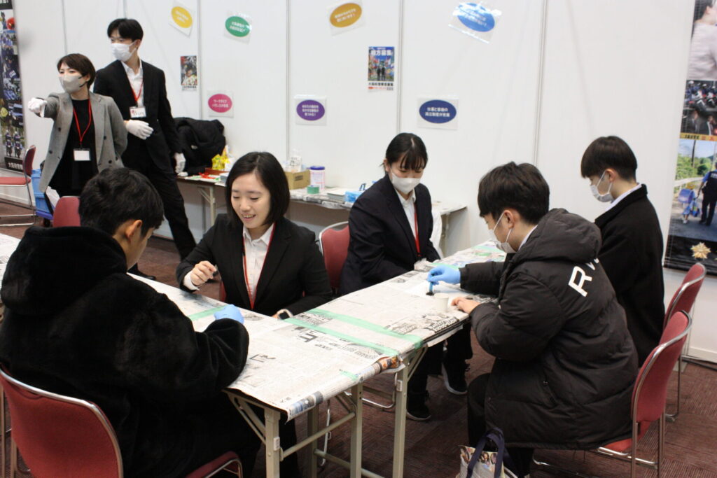大阪府木材連合会の大工・森のお仕事のブースでは、参加者はスタッフのサポートを受けながら丸太切りに挑戦。丸太をのこぎりで切るのは意外に難しいようでした。インパクトドライバーでビスを板に打ち込むフローリングの施工体験もありました。大阪府警察本部では鑑識の指紋採取の体験。生徒たちは「指紋は1人1人違っていて、一生変わらないんだよ」との説明を受け、興味津々でした。