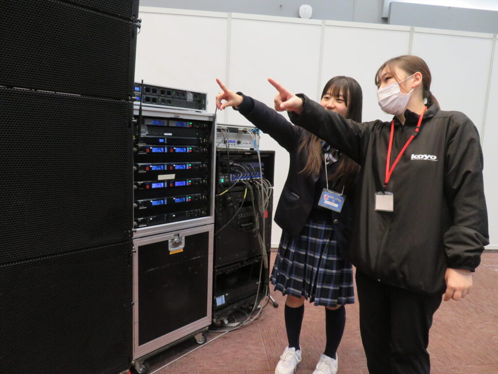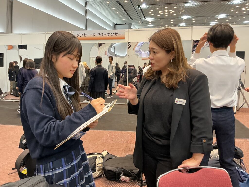 ダンスや音楽の学びについて、大阪ダンス・俳優&舞台芸術専門学校の先生から話を聞くこともできました。ダンサーや歌手として踊ったり歌ったりする仕事は、いつまでも続けられるとは限らない。でも、その経験を活かして振り付けや演出、プロデュースの仕事へとキャリアを広げることもできる…。そんなことを教わりました。出会った大阪ECO動物・海洋専門学校の学生スタッフにも話を聞く熱心さでした。