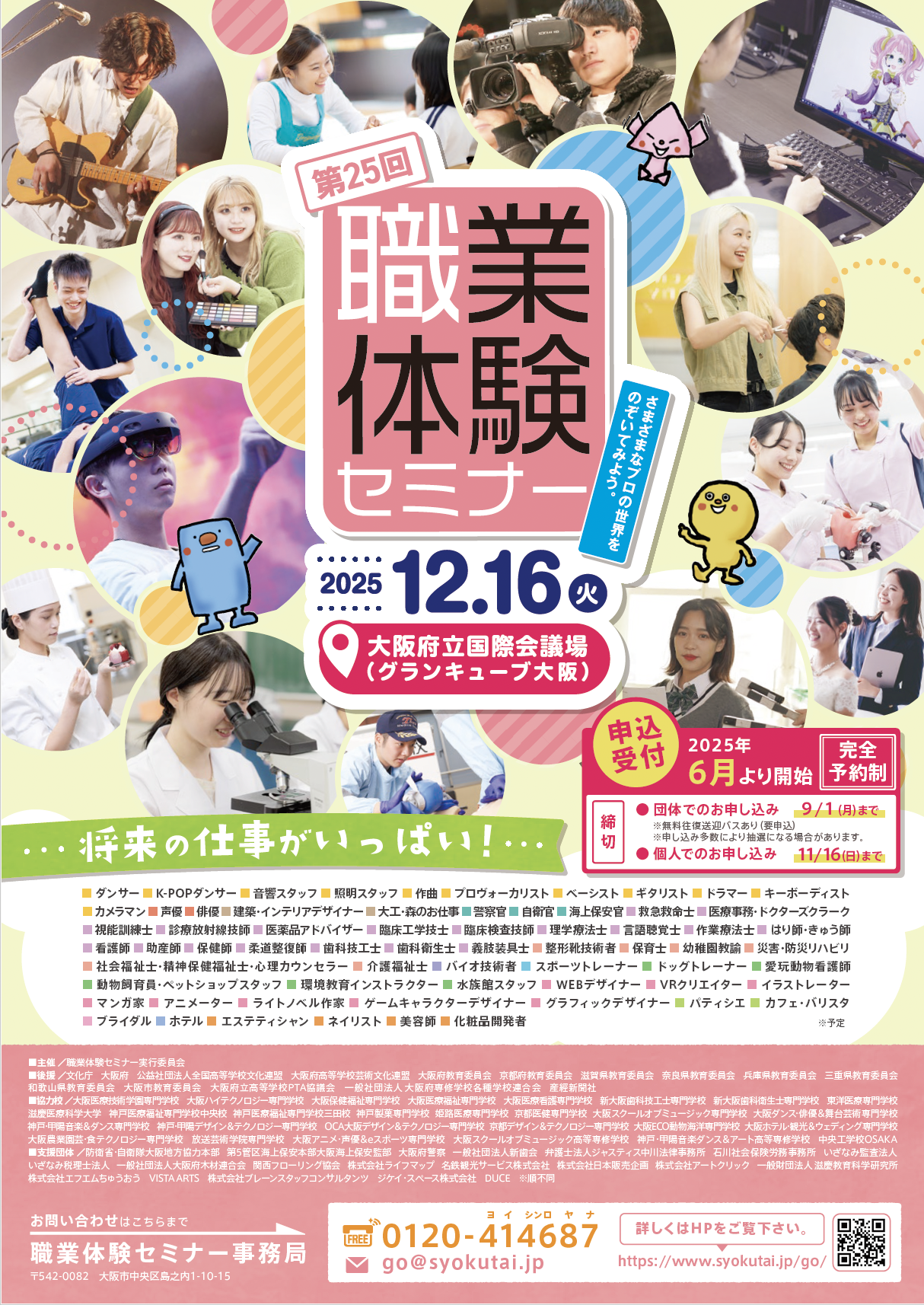 職業体験セミナーは、文化庁や大阪府、関西各府県の教育委員会などの後援のもと、滋慶学園グループの25校と企業・団体が協力して運営しました。