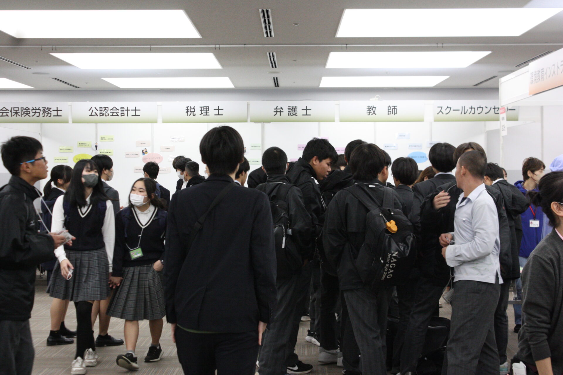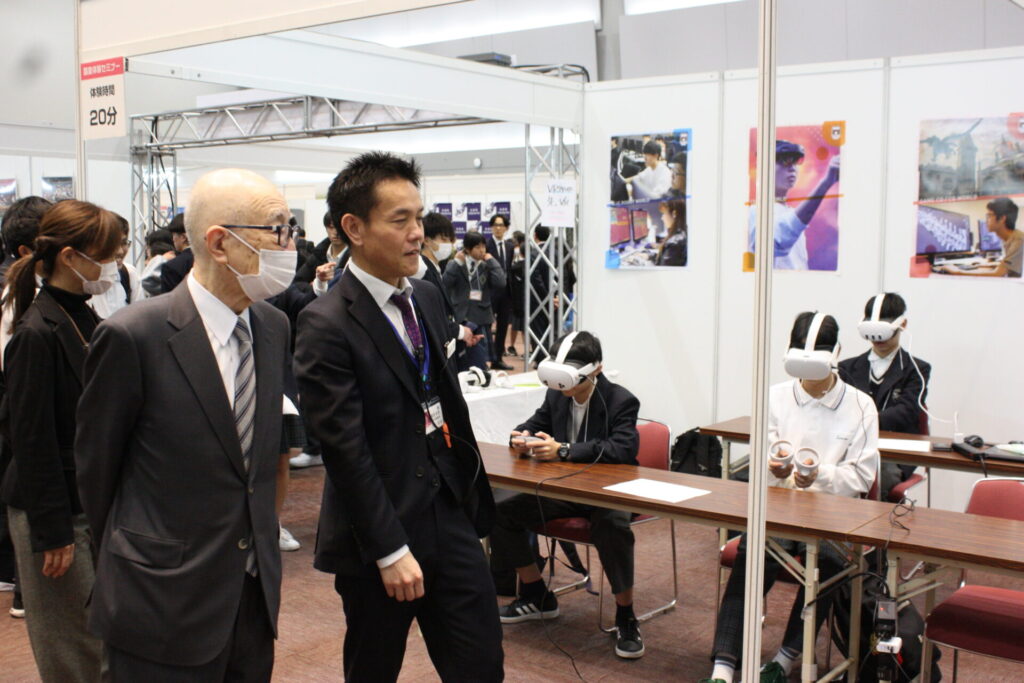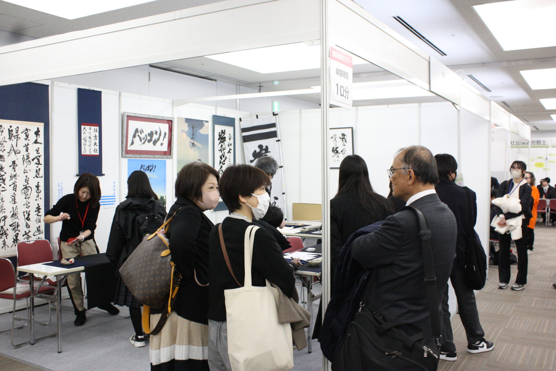 滋慶学園グループの浮舟邦彦総長は、小路則幸委員長(大阪スクールオブミュージック専門学校)の案内で会場を視察しました。セミナーは今回も林業・木材業界団体の大阪府木材連合会や、自衛隊大阪地方協力本部、第5管区海上保安本部大阪海上保安監部、建築・インテリアの専門学校などの出展があり、それぞれ仕事の意義や魅力を伝えていました。また、今回は書道家、企業経営者の体験ブース、スクールカウンセラーの紹介コーナーが初めてお目見えしました。