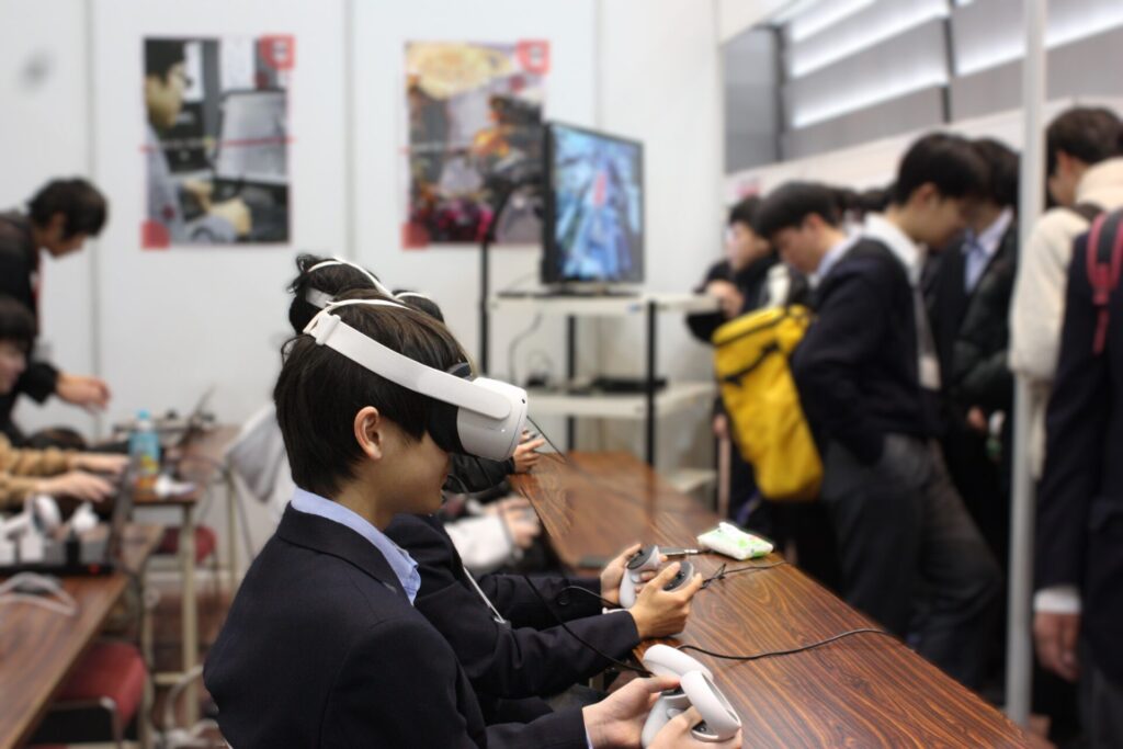 VRクリエーターの体験は、学校に続く道に設定された様々な障害をクリアしながら目的地へたどりつくことを競うゲーム。参加者たちはゴーグルを装着し、キャラクターになった気分で、夢中になってコントローラーを操作していました。このコーナーも大人気で人だかりができていました。またイラストレーターのブースでは缶バッジ制作。図工の授業のように、ワイワイガヤガヤと楽しそうでした。