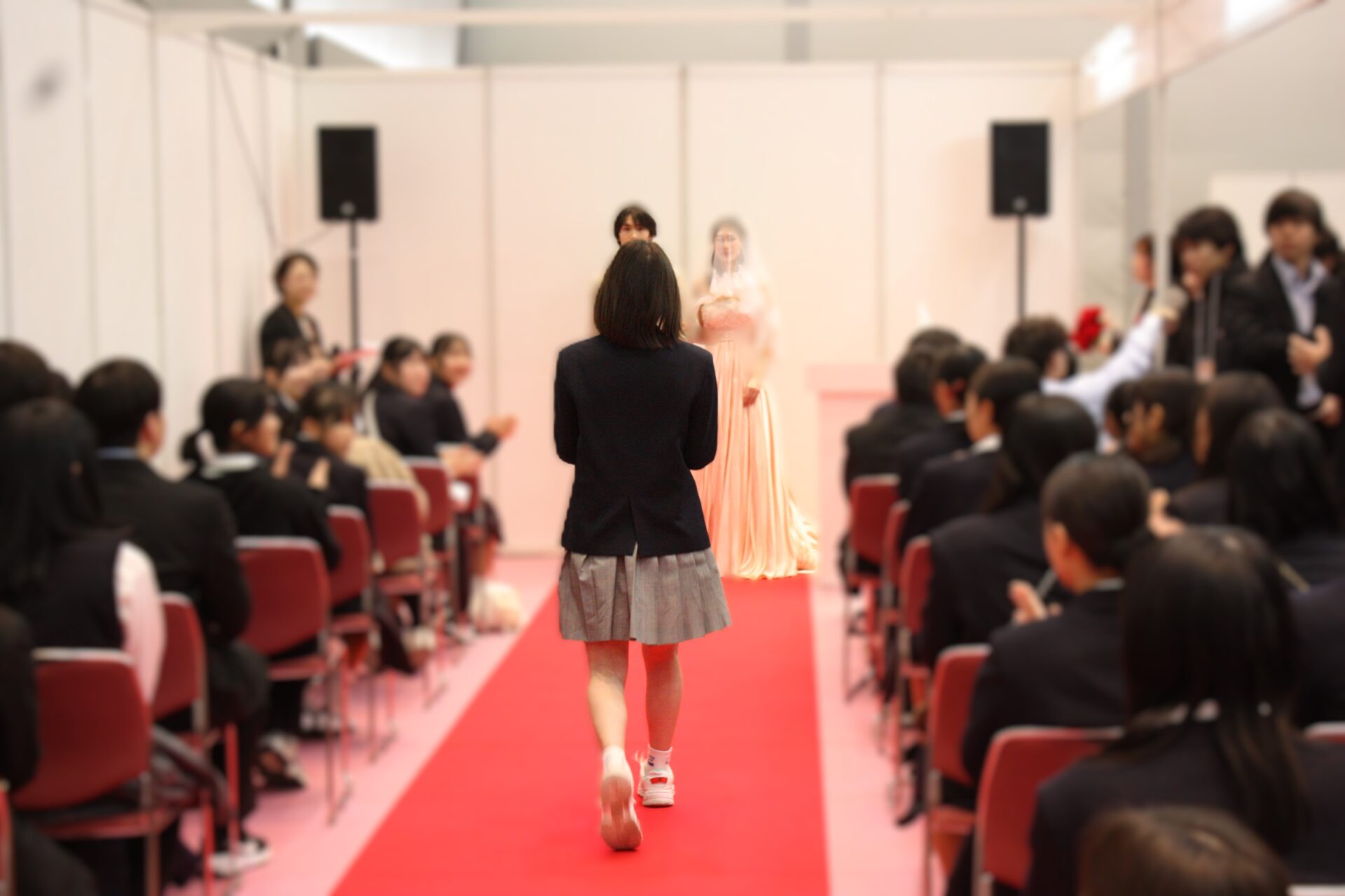 ブライダルのブースでは、生徒たちがブライダルスタッフを体験。結婚式のセレモニーで新郎・新婦に結婚指輪を届けるリングガール、リングボーイの仕事や、バラの花束を運ぶスタッフの役割を演じました。美容師ブースでは、マネキン人形を使って髪にパーマをあてるテクニックを教わりました。さすがに多くの女子生徒でにぎわい、順番待ちの列ができていました。