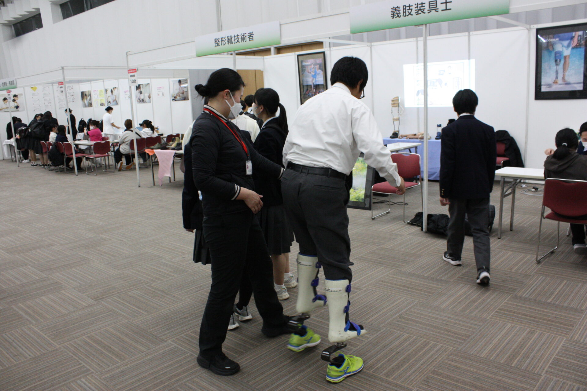 義手や義足を製作したり調整したりする義肢装具士のコーナーでは、実際に義足を装着して歩いてみました。歯科技工士は入れ歯や歯矯正装置を作るのが仕事。こちらでは、歯の形を見ながら「歯の立体パズル」を体験しました。