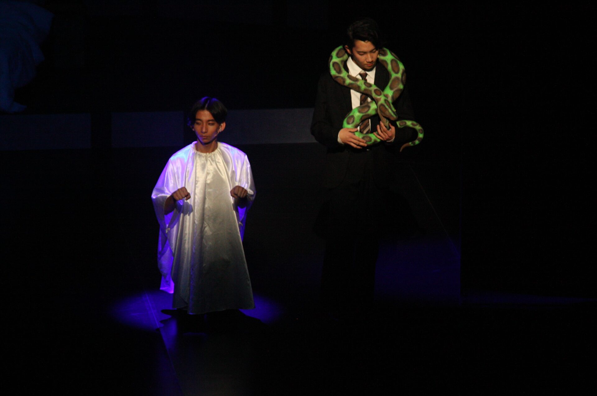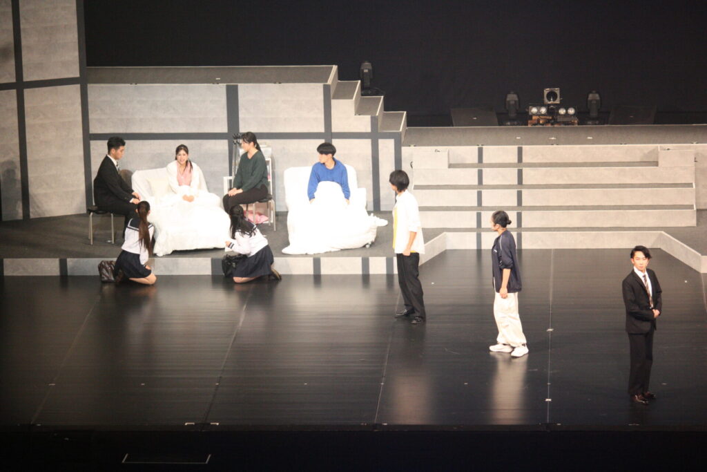 大阪公演はキャストをはじめ舞台制作や音響、照明、映像などすべて学生がつくりあげました。劇中のバンドは、プロのミュージシャンを目指す姉妹校の神戸・甲陽音楽&ダンス専門学校の学生が担当。出演者のケアはトレーナーを目指す京都医健専門学校の学生が担いました。また耳の不自由な人もミュージカルを楽しめるよう、舞台袖のモニターに台詞が表示されました。